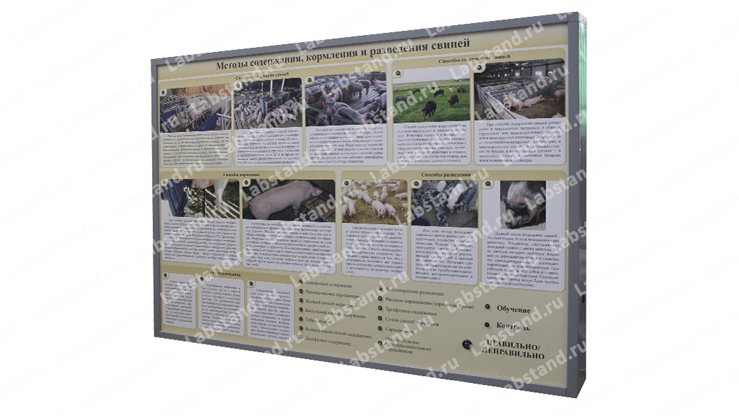 Описание: Стенд-планшет представляет собой каркасную конструкцию, на лицевой панели которой наклеена пленка с изображением методов содержания, кормления и разведения свиней.
