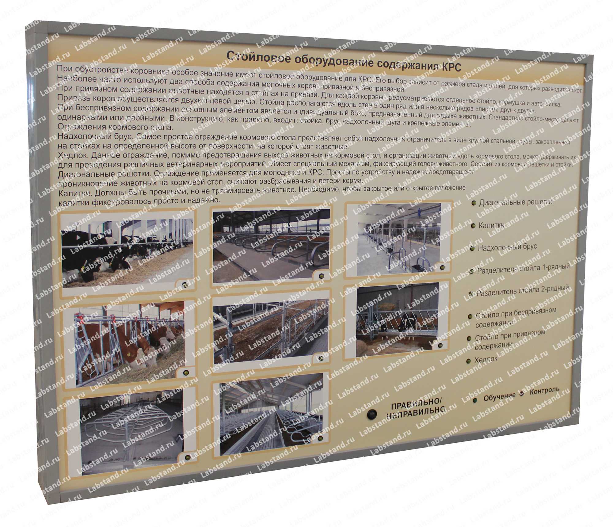 Назначение: Стенд-планшет предназначен для изучения стойлового оборудования при содержании крупного рогатого скота и его составных элементов.