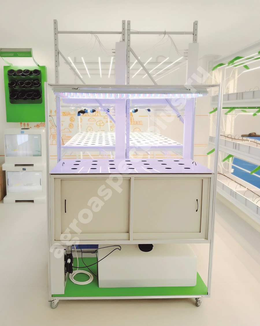 Установка модульная, легкосборная; питательный раствор обеззараживается УФ излучением; контроль уровня раствора — автоматический.