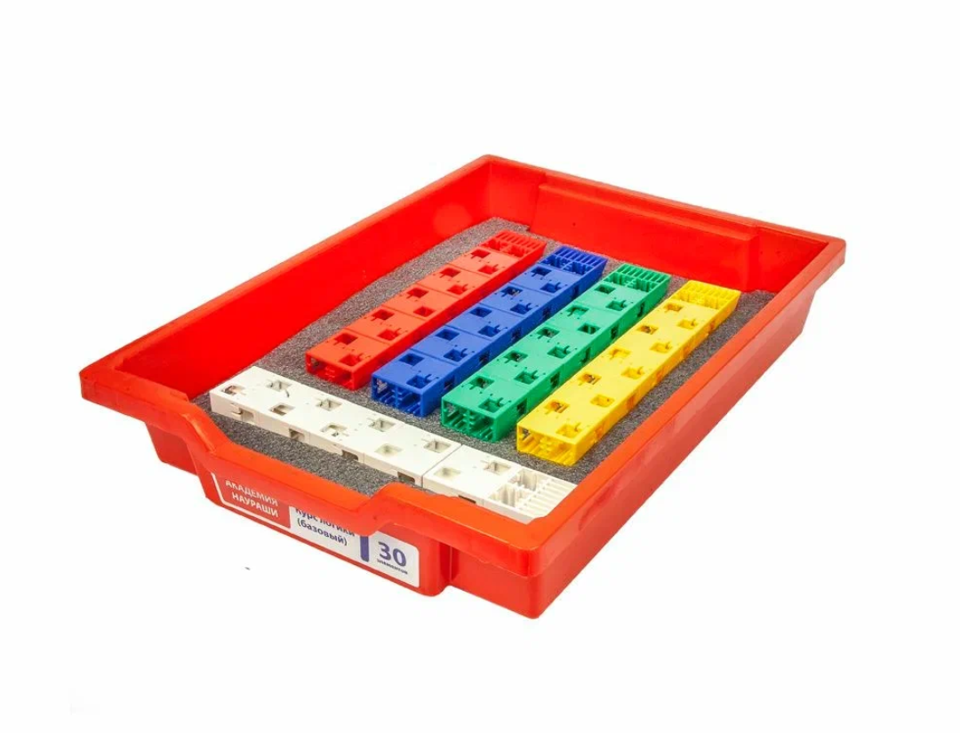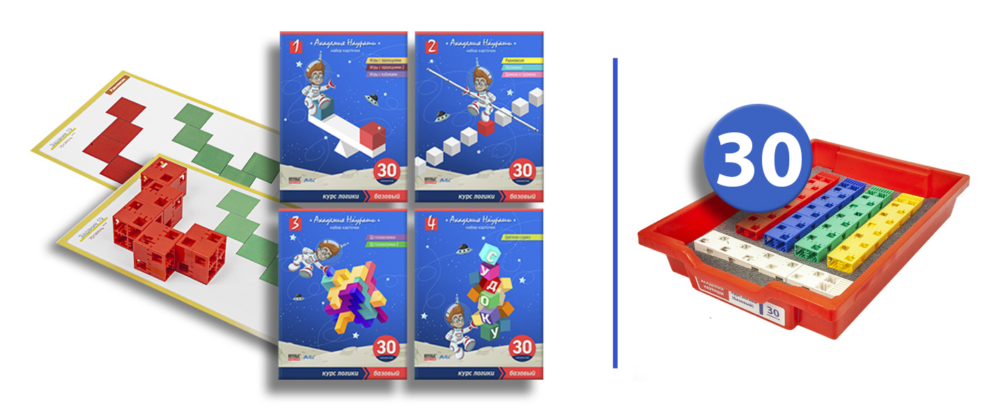 Курс рассчитан на работу 1-2 детей одновременно, при этом возможны как индивидуальные, так и групповые занятия по 3-5 человек. Комплект упакован в специальный лоток (в него помещается 30 кубиков).