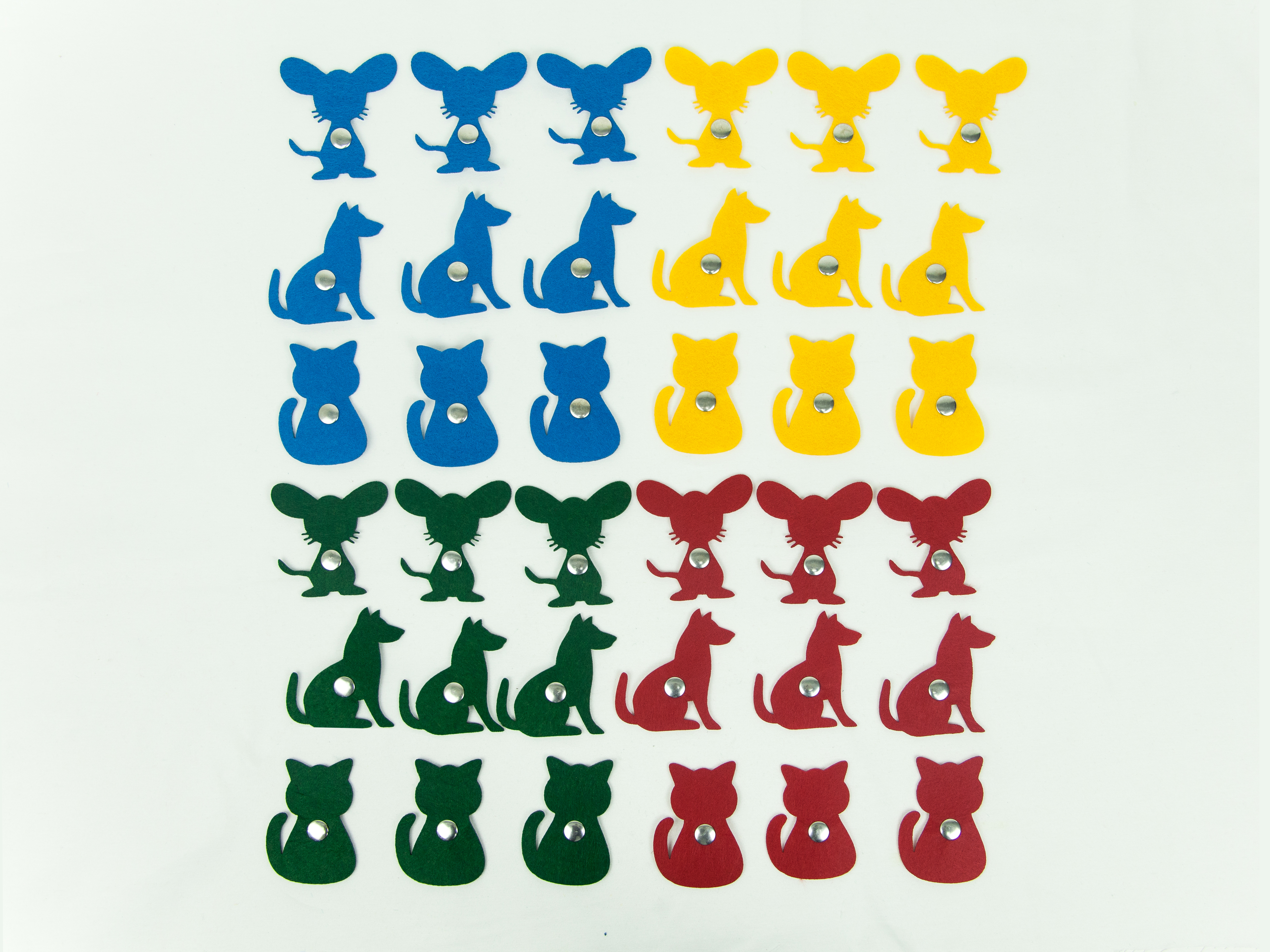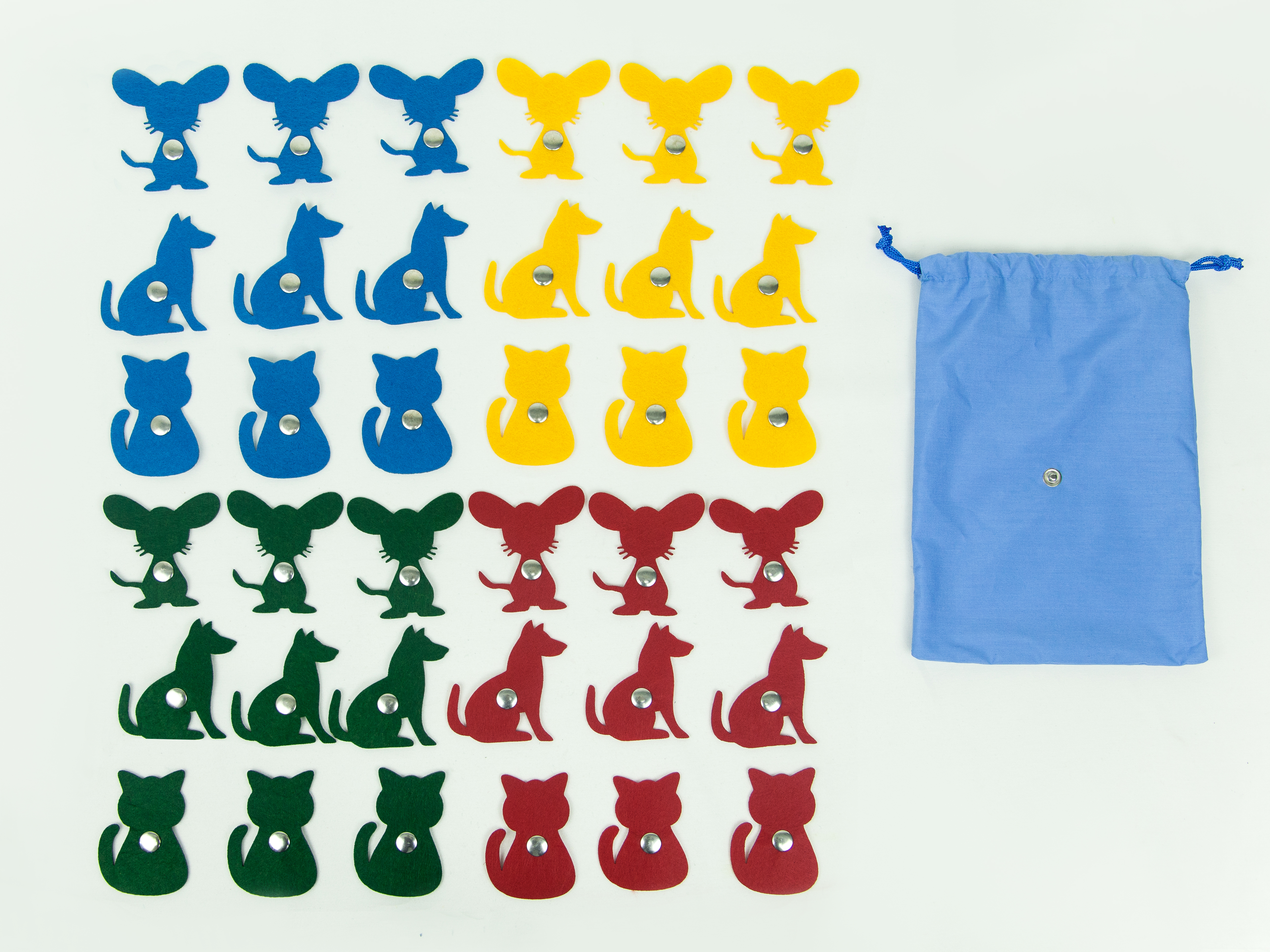 Комплектация: 3 фигуры -мышки, котики, собачки - 4 цвета -  синий красный, желтый, зеленый, по 3 штуки; мешочек для фигур.