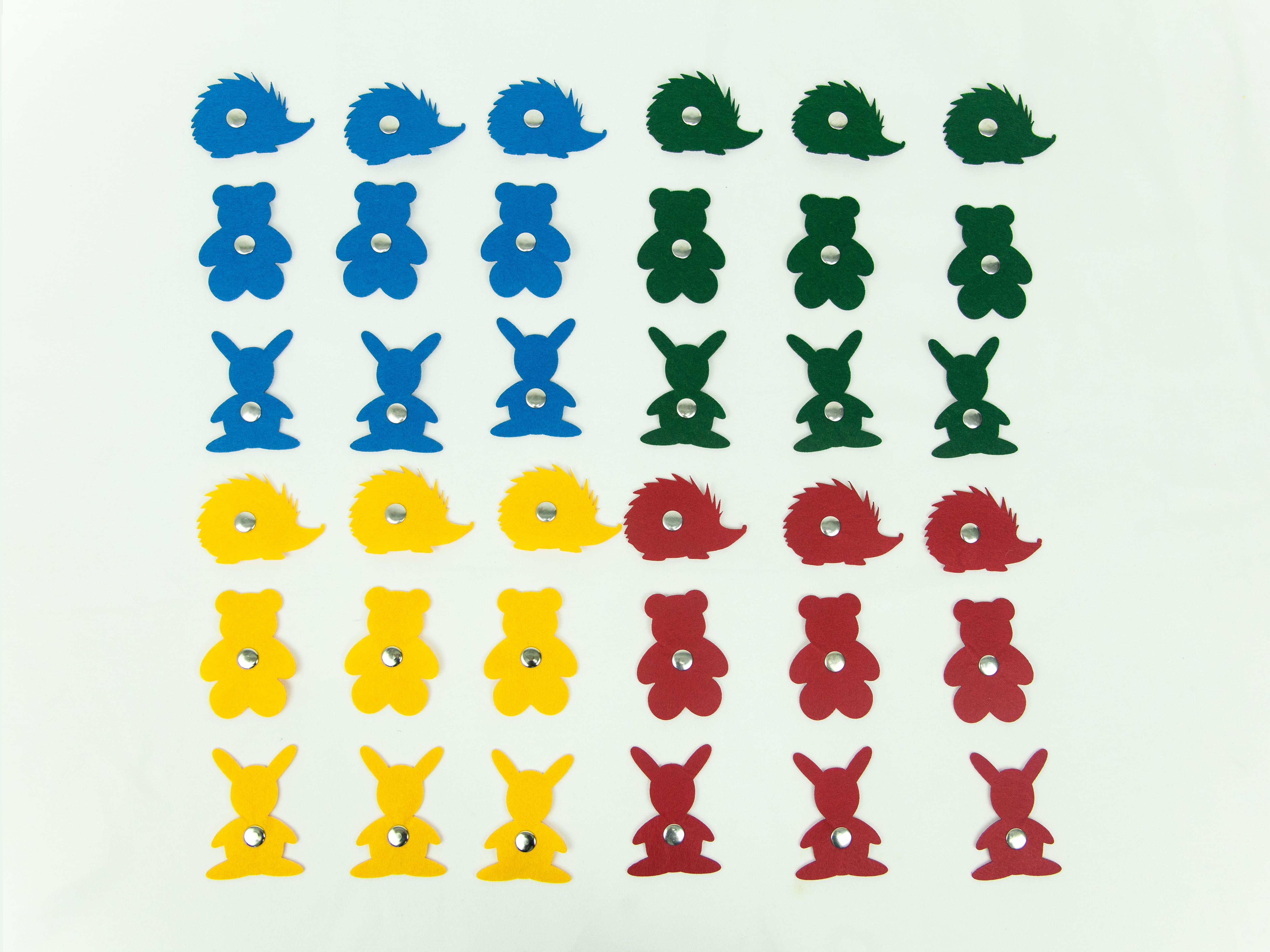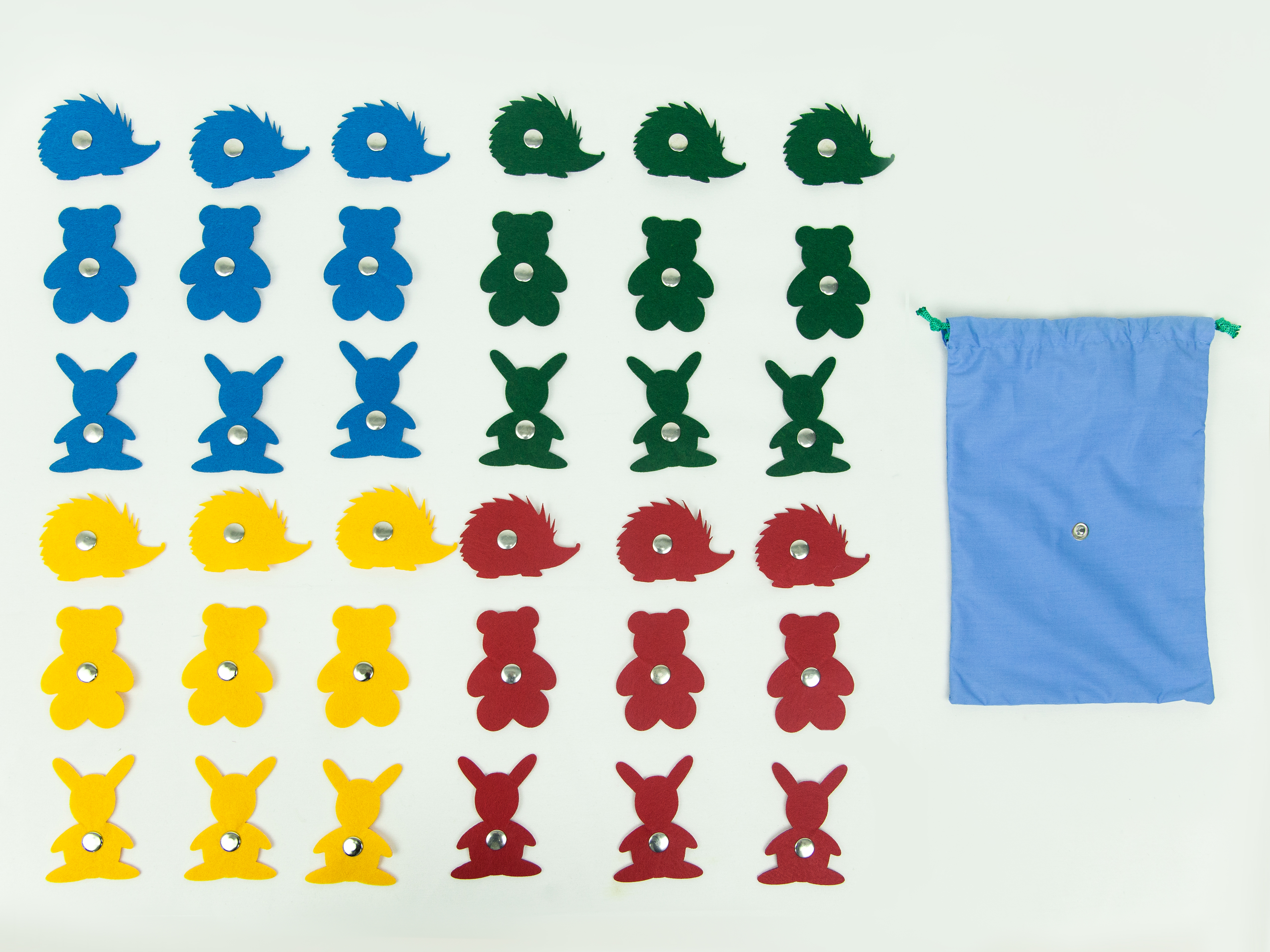 Комплектация: 3 фигуры - зайчики, мишки, ежики- 4 цвета -  синий красный, желтый, зеленый, по 3 штуки; мешочек для фигур.