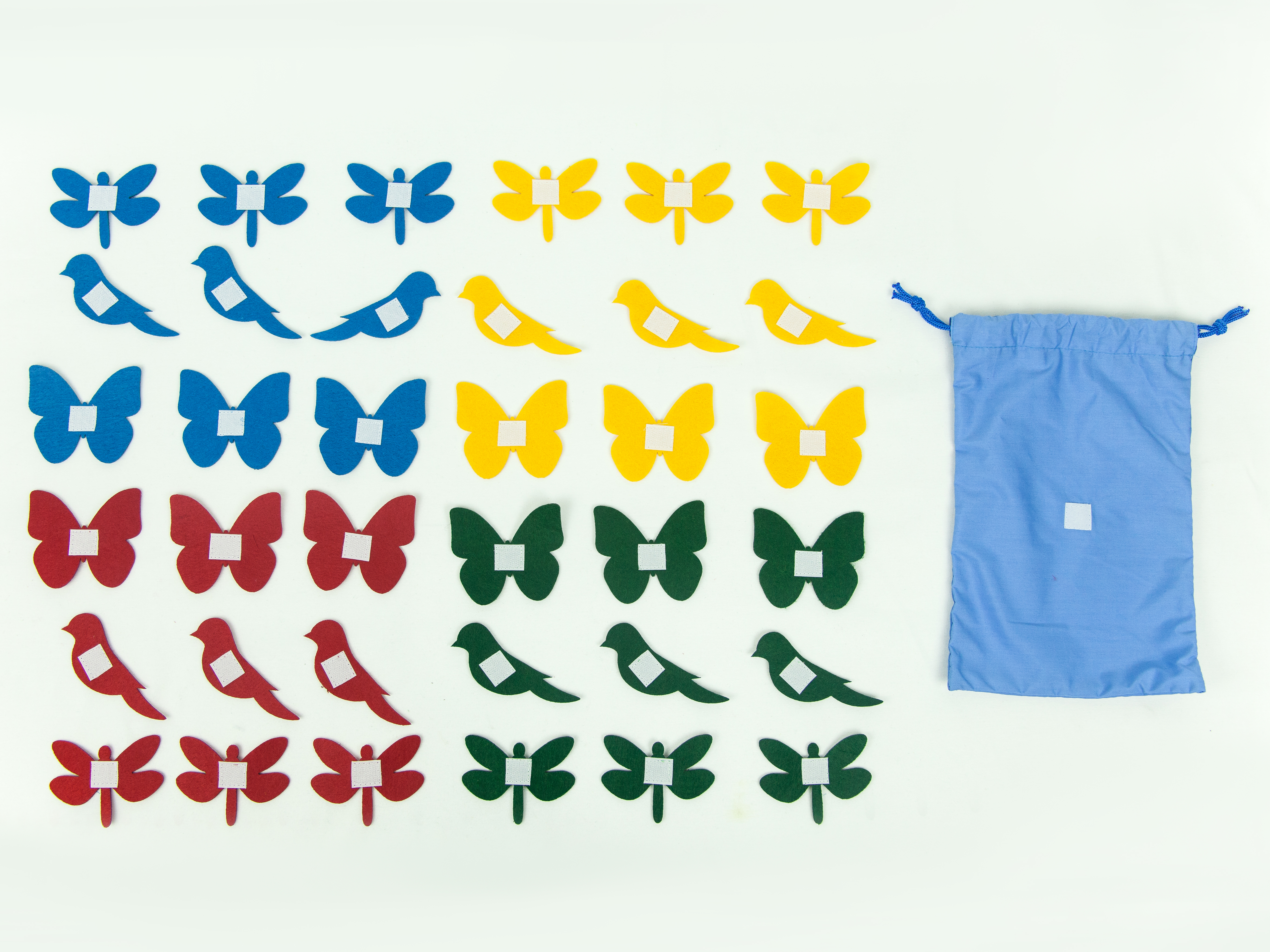 Комплектация: 3 фигуры - бабочки, птички, мухи - 4 цвета (синий красный, желтый, зеленый) по 3 штуки; на фигурах пришита жесткая часть липучки; мешочек для фигур.