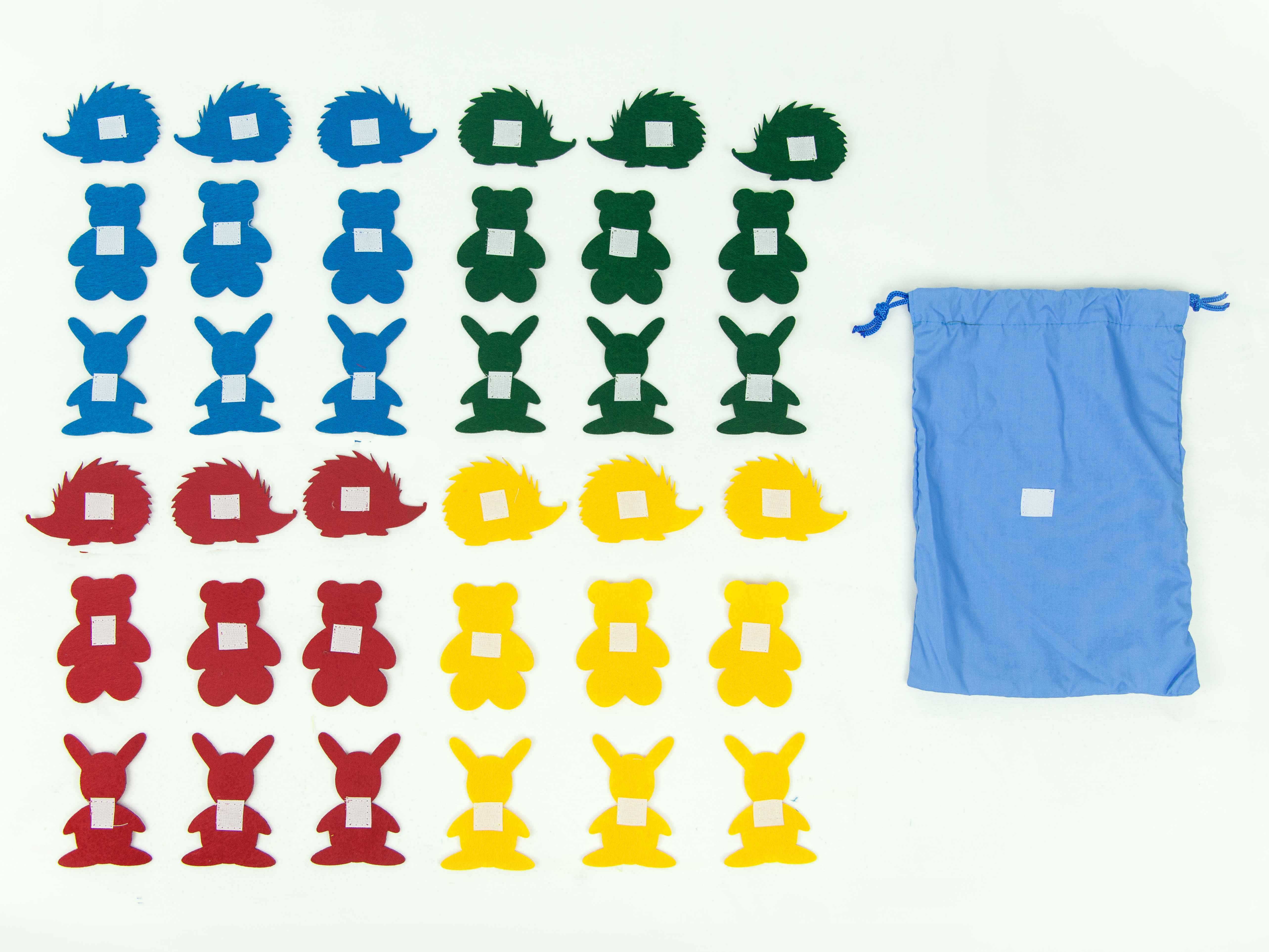 Комплектация: 3 фигуры - зайчики, мишки, ежики- 4 цвета -  синий красный, желтый, зеленый, по 3 штуки; мешочек для фигур.