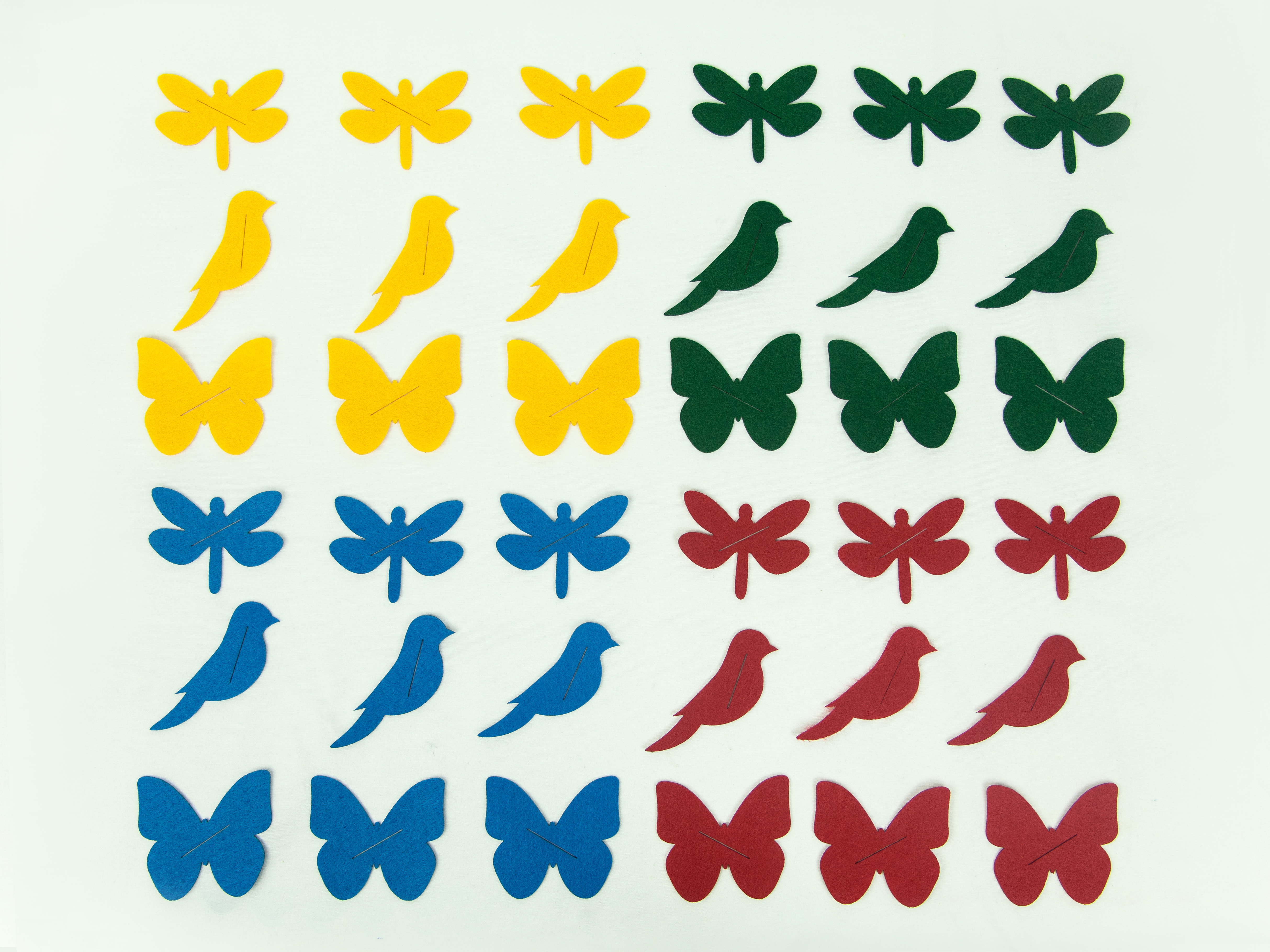 Комплектация: 3 фигуры - бабочки, птички, мухи - 4 цвета -  синий красный, желтый, зеленый, по 3 штуки; на фигурах прорезаны петли; мешочек для фигур.
