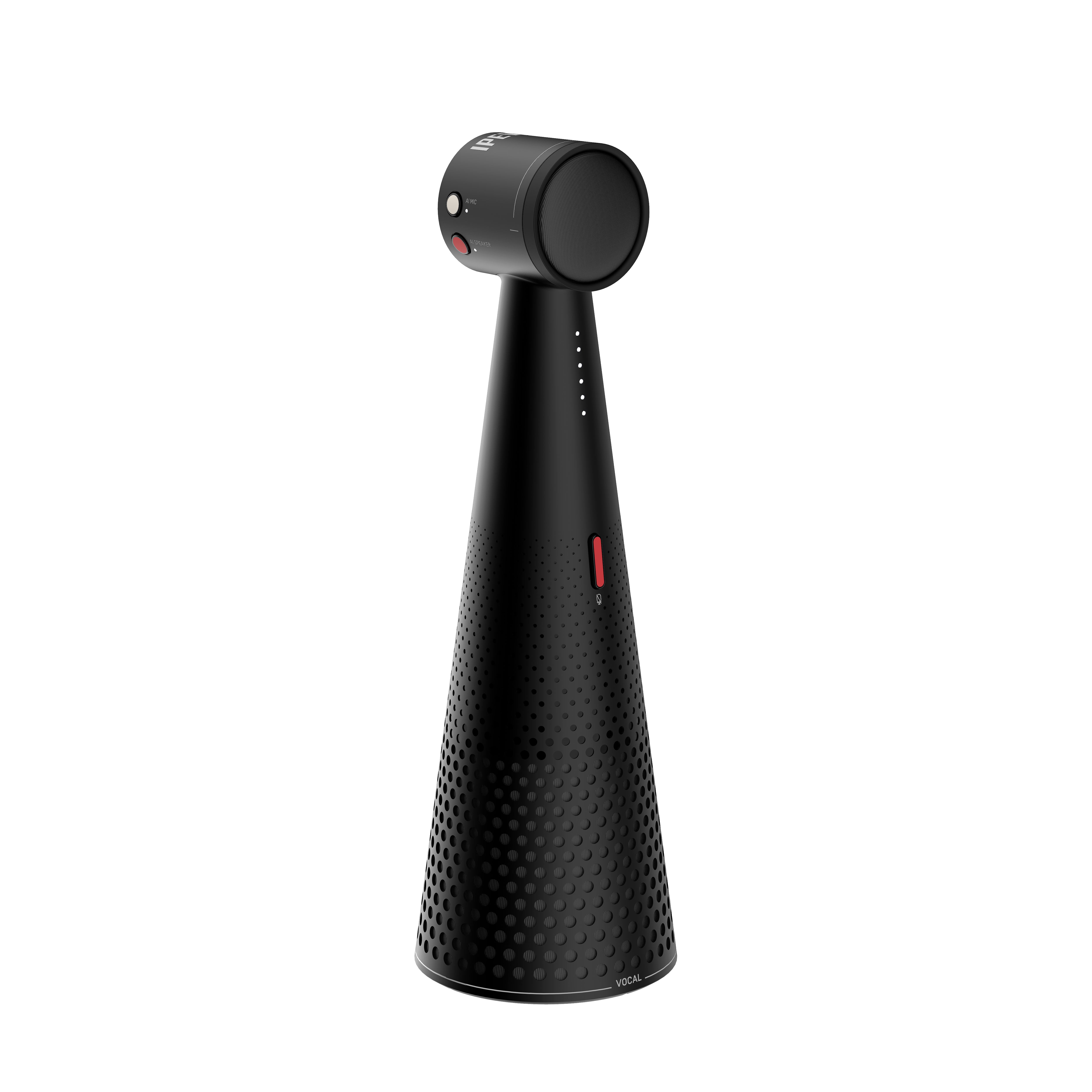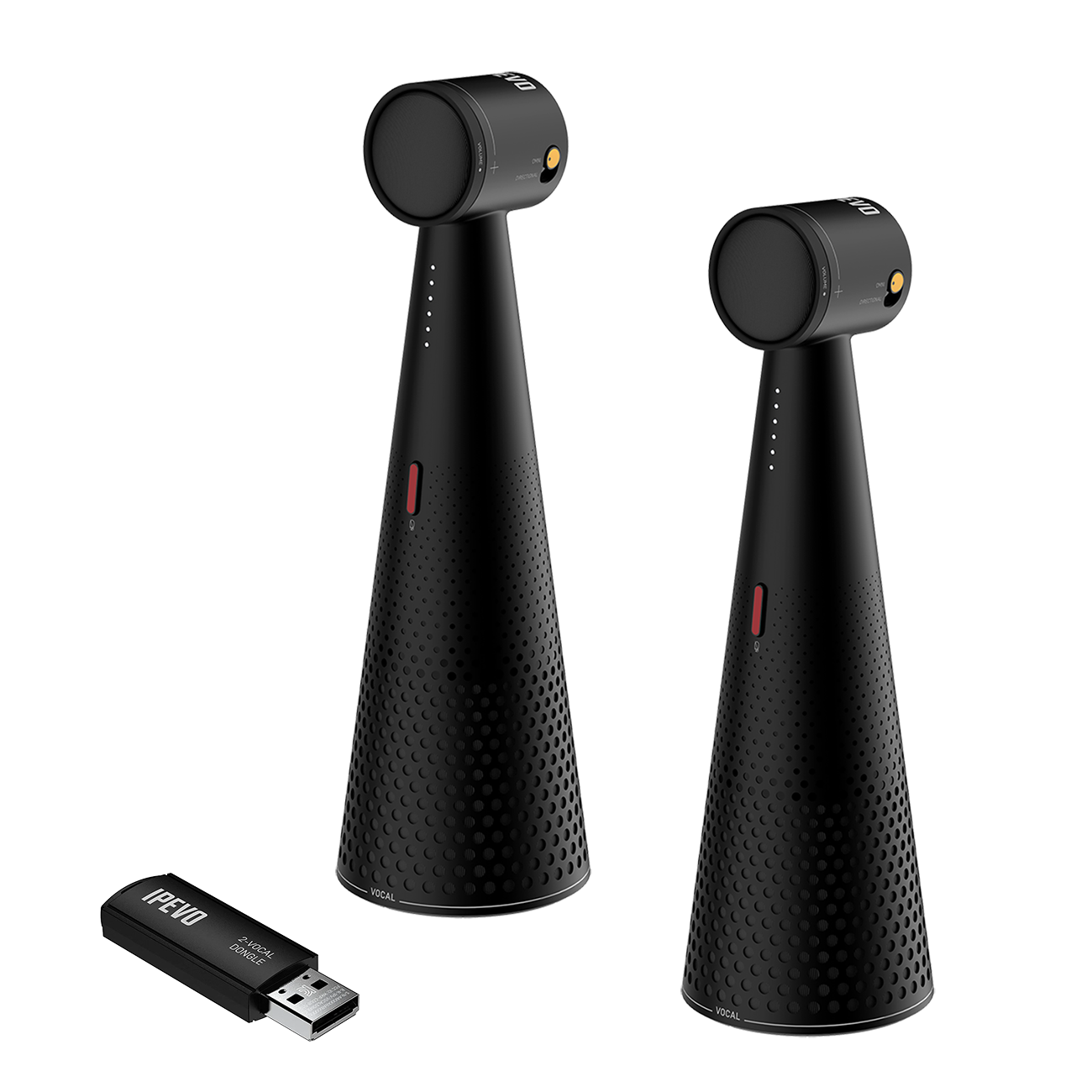 - два спикерфона IPEVO VOCAL, оснащенных цифровыми микрофонами с функциями направленного (120°) и всенаправленного (360°) захвата голоса на расстоянии до 5 м, а также всенаправленным динамиком мощностью 5 Вт и технологией двухстороннего шумоподавления на базе ИИ. Встроенная батарея 3640 mAh (40 часов работы при 50% громкости динамика). Зарядка до 100% за 3,5 ч. Интерфейсы подключения: USB-С (кабель 1,2 м), Bluetooth 5.1. Размеры: 72 × 72 × 242 мм. Вес: 345 г. Электропитание: 5 V 500 mA. Цвет: черный.