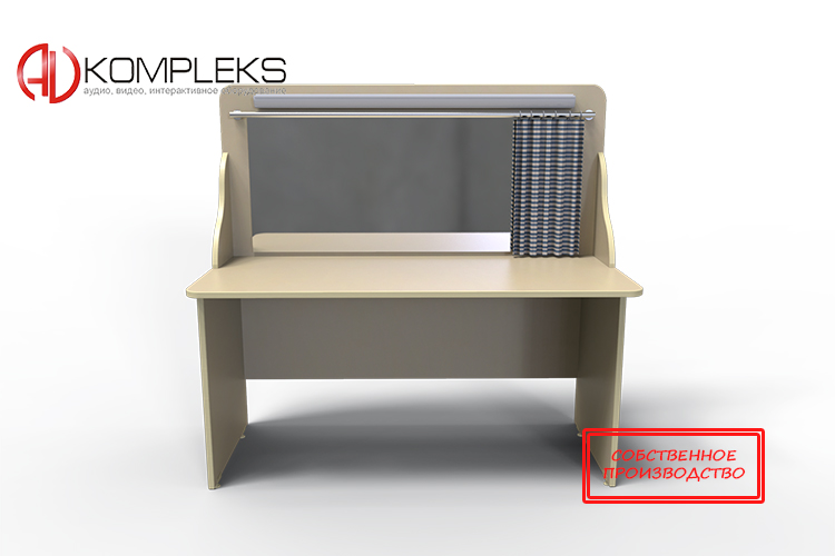Декоративный корпус выполнен из ламинированной ДСП, а его кромка – из ПВХ. Цвет подбирается по желанию заказчика. Стол органично впишется в кабинет логопеда или психолога. Работать за ним возможно, как с одним ребенком, так и с двумя. На столешнице достаточно места, чтобы хранить дополнительные материалы для урока. В комплектацию входит уже установленное зеркало, лампа для его подсветки, ширма. Размеры мебели составляют 1080 х 1200 х 450 мм, а вес не превышает 40 кг.