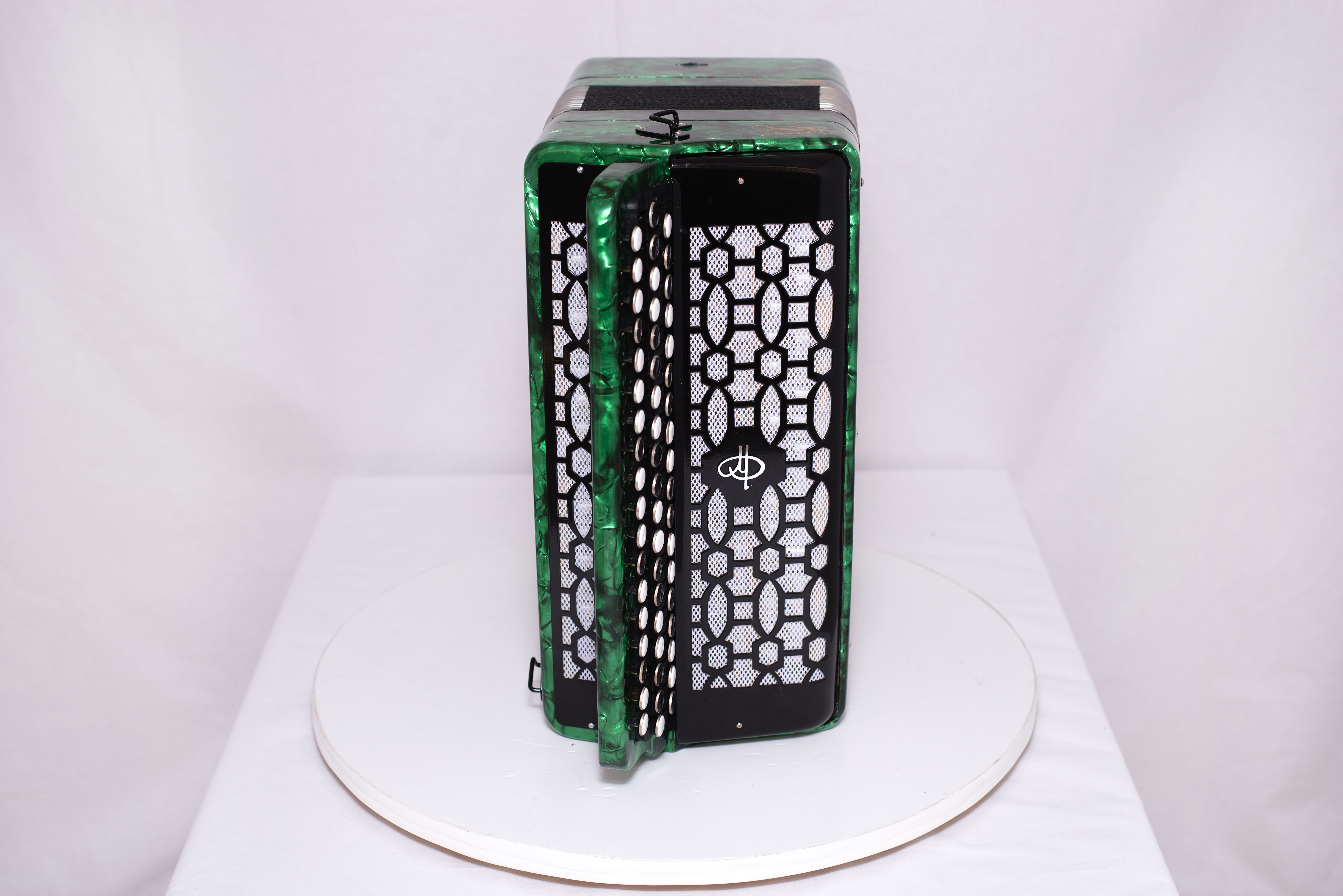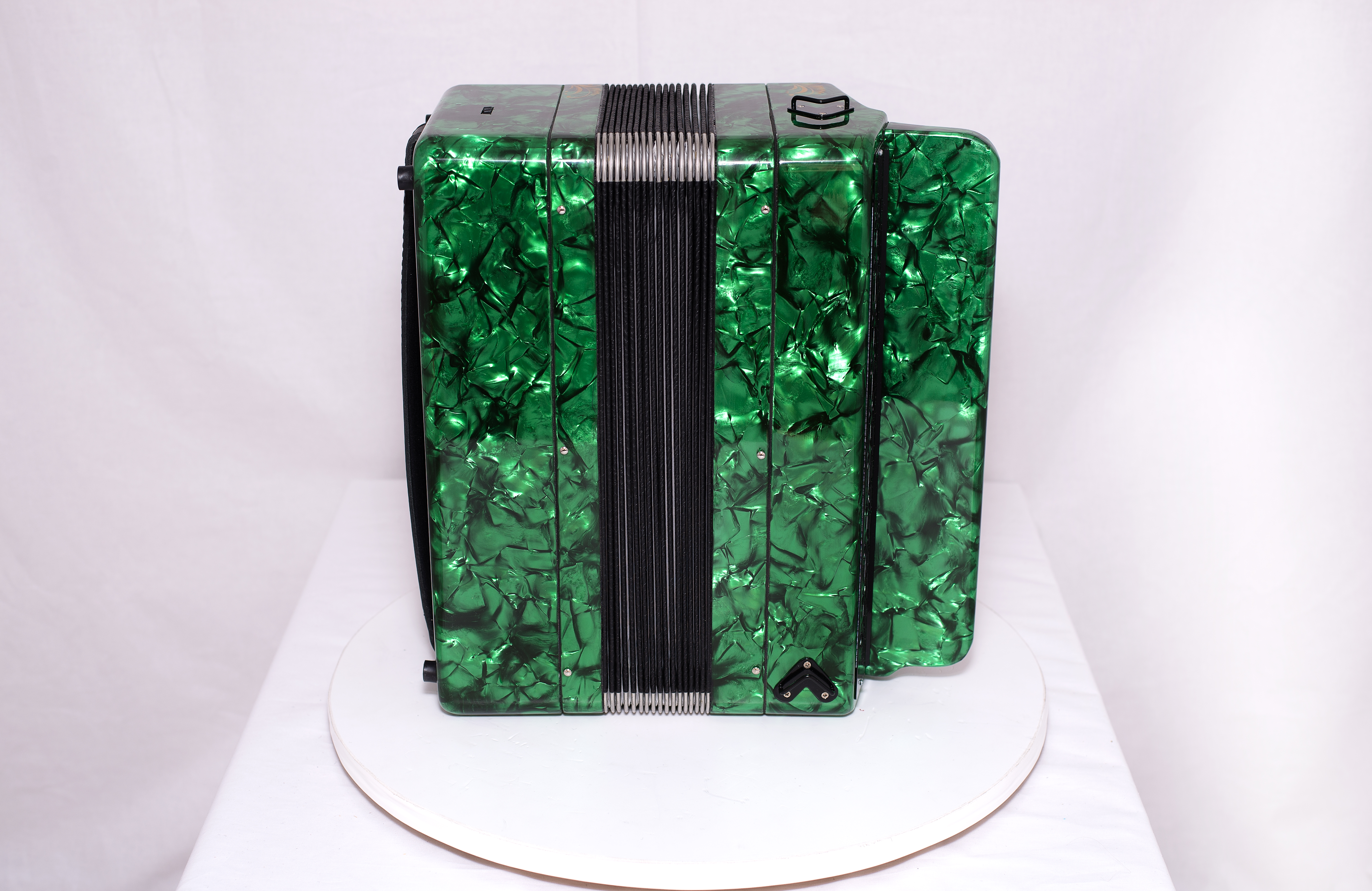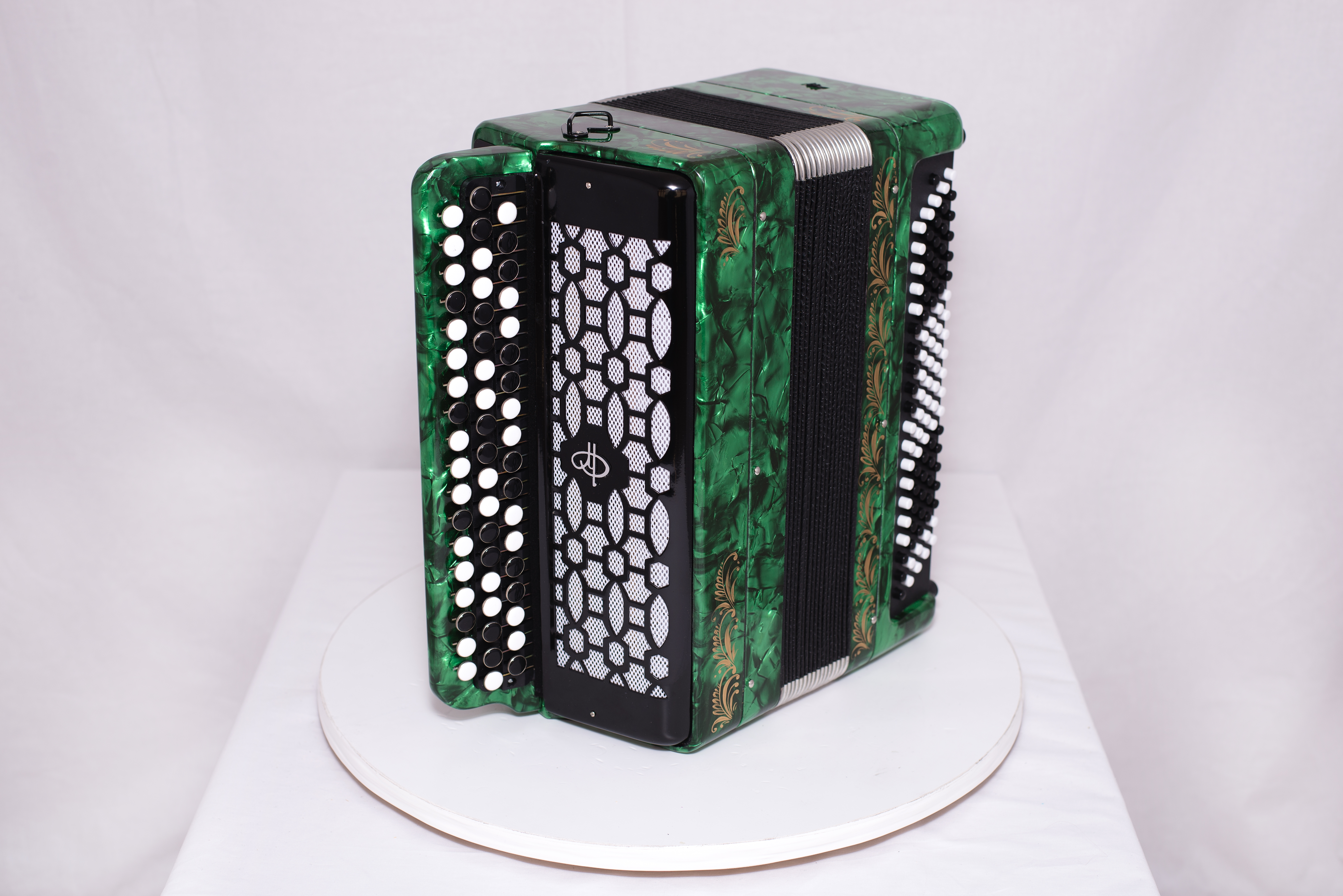 3-х рядный, двухголосный, с готовым аккомпанементом, кусковая планка. В правой части двухголосное звучание 55 нот от ноты ЛЯ-диез большой октавы до ноты МИ четвертой октавы, в левой части пятирядный готовый аккомпанемент от ноты ФА контроктавы до ноты МИ большой октавы с одновременным звучанием в четырех октавах.