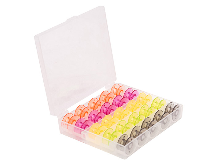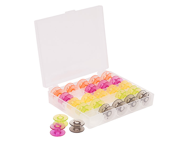 25 прозрачных цветных шпулек в удобном боксе для хранения. Предназначены для современных бытовых швейных машин с вертикальным и горизонтальным челноками.