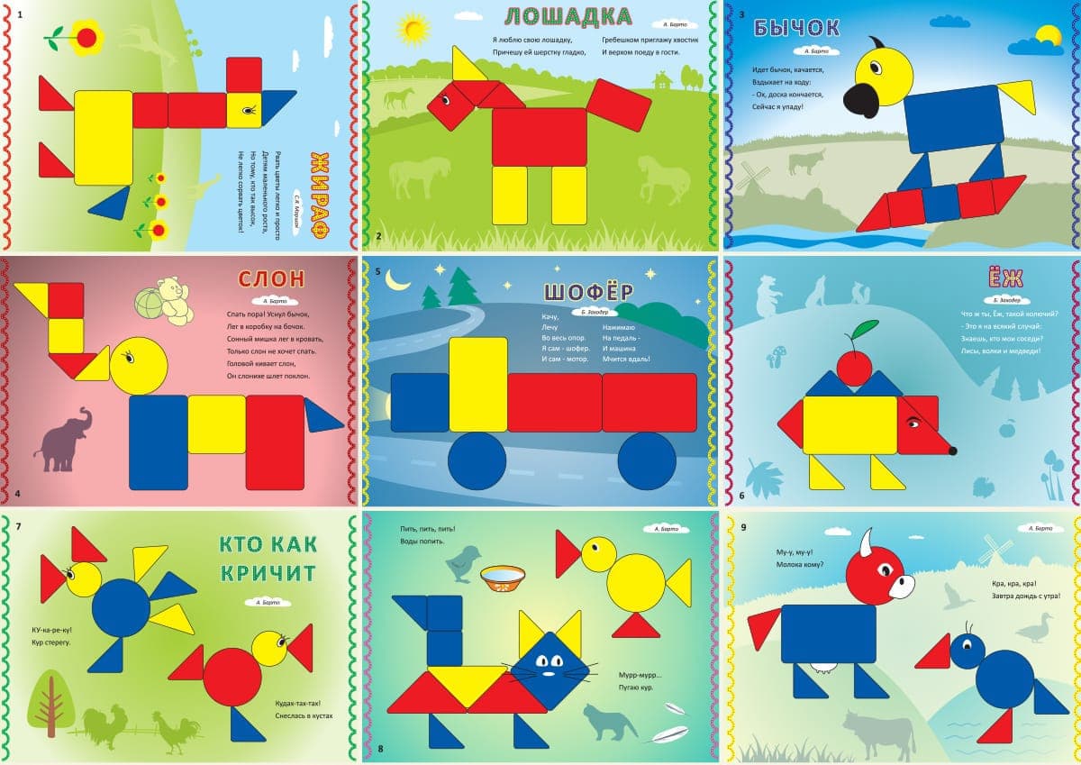 БЛОКИ ДЬЕНЕША для самых маленьких 2 (игровой материал к блокам Дьенеша).  Альбом заданий (16 стр. А4) Каждая страничка - это красочное задание для ребёнка 3-4 лет. Всего 18 заданий. Предлагается самим создать слона, жирафа, грузовик.... Надо выбрать блоки такой же формы, цвета и размера как на изображении. Игры в альбоме сопровождаются короткими стихами и физкультминутками. Эта игровая деятельность стимулирует развитие речи, инициативности и самостоятельности. А стихи лучших детских поэтов (А. Барто, Б. Заходера, С. Маршака и др.), которые он услышит от взрослых, будут, мы надеемся, способствовать развитию художественного вкуса, приобщать к литературе. Для моделирования рисунков альбома Вам понадобится всемирно известный дидактический материал Логические блоки Дьенеша.