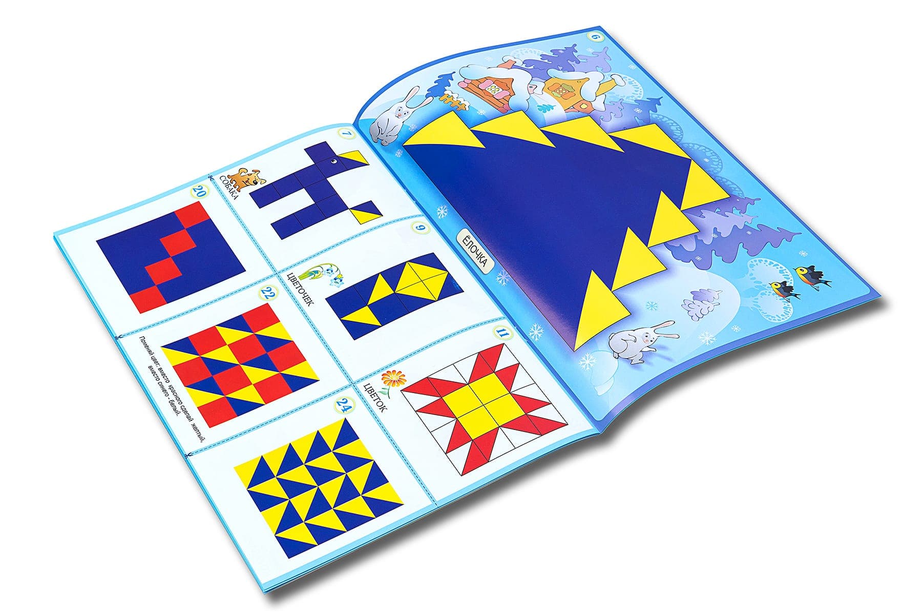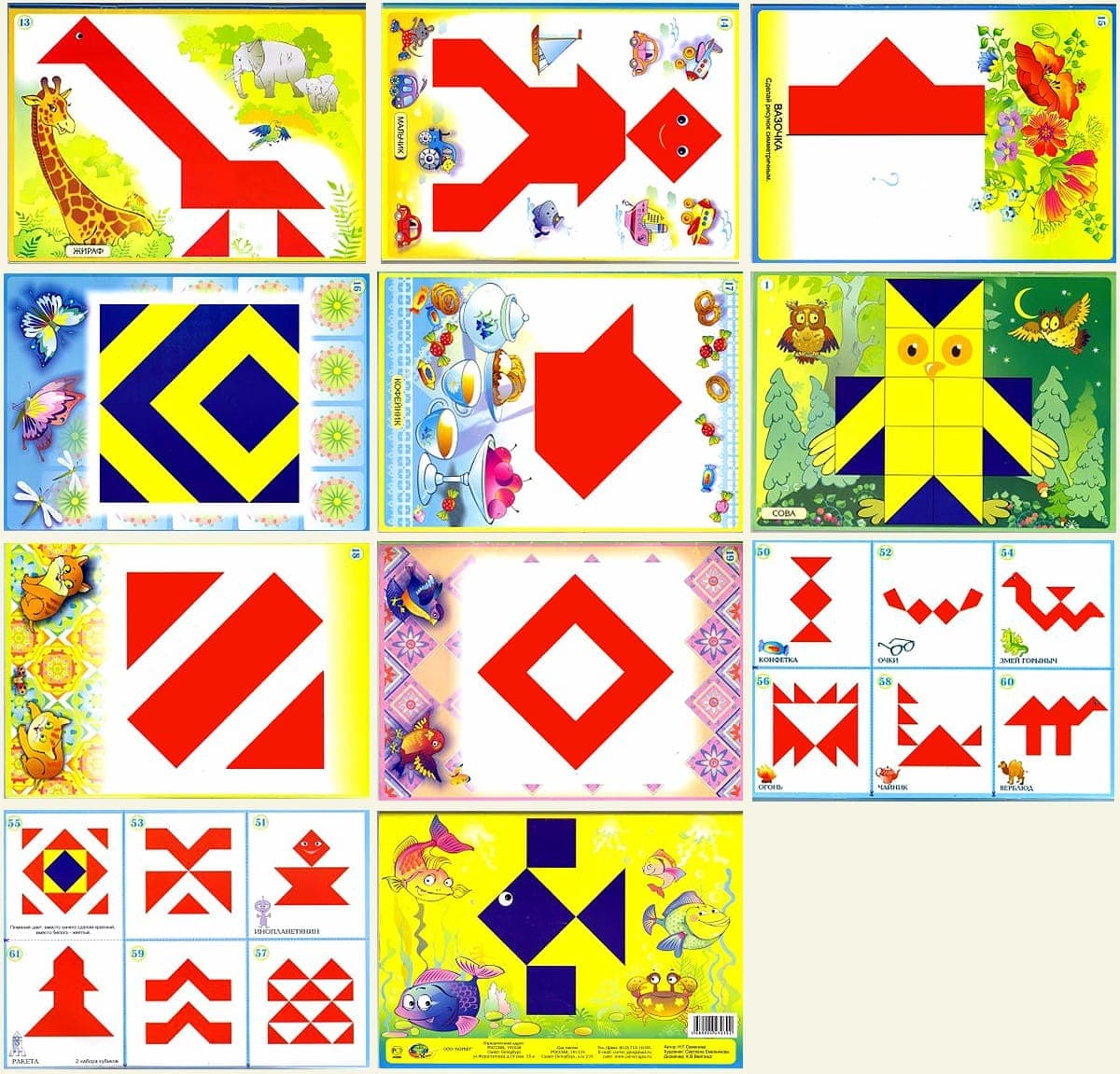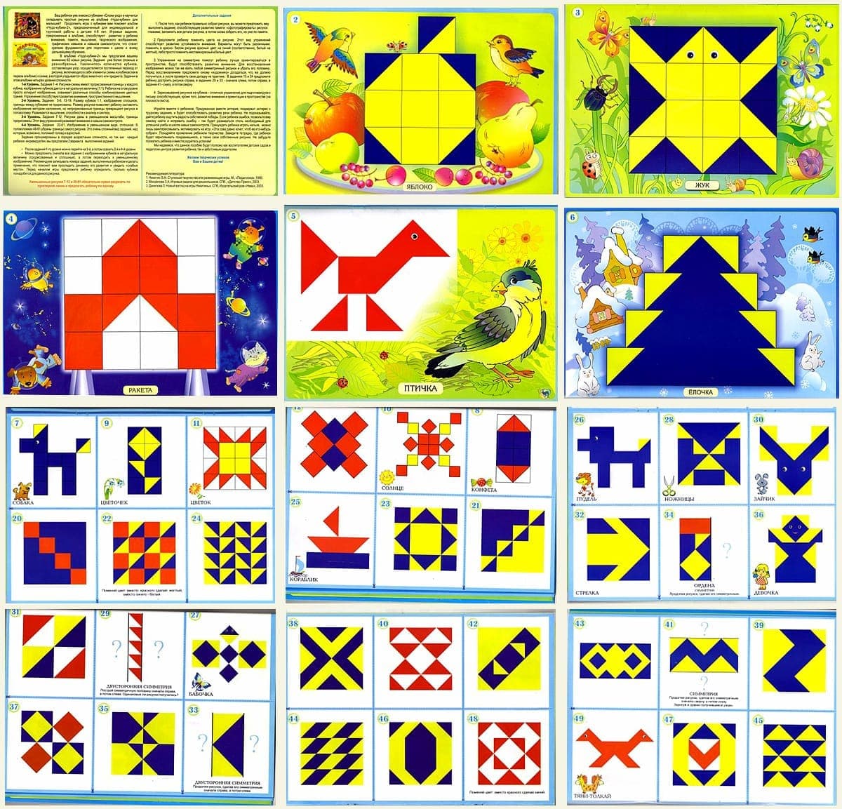 Альбом заданий  для детей 4-8 лет. 24 стр.(А4) -  62 авторских задания. Задания в альбоме более сложные и разнообразные. Представлены четырьмя уровнями сложности: 1-й - рисунки-схемы имеют прорисованные границы кубика, изображение кубика в натуральную величину (1:1); 2-й - размер кубиков 1:1, изображение сплошное, границы между кубиками не прорисованы; 3-й - рисунки даны в уменьшеном масштабе, границы прорисованы; 4-й - изображение в уменьшеном масштабе, сплошное. В некоторых головоломках убраны границы самого рисунка. Для игры с альбомом необходимы кубики СЛОЖИ УЗОР