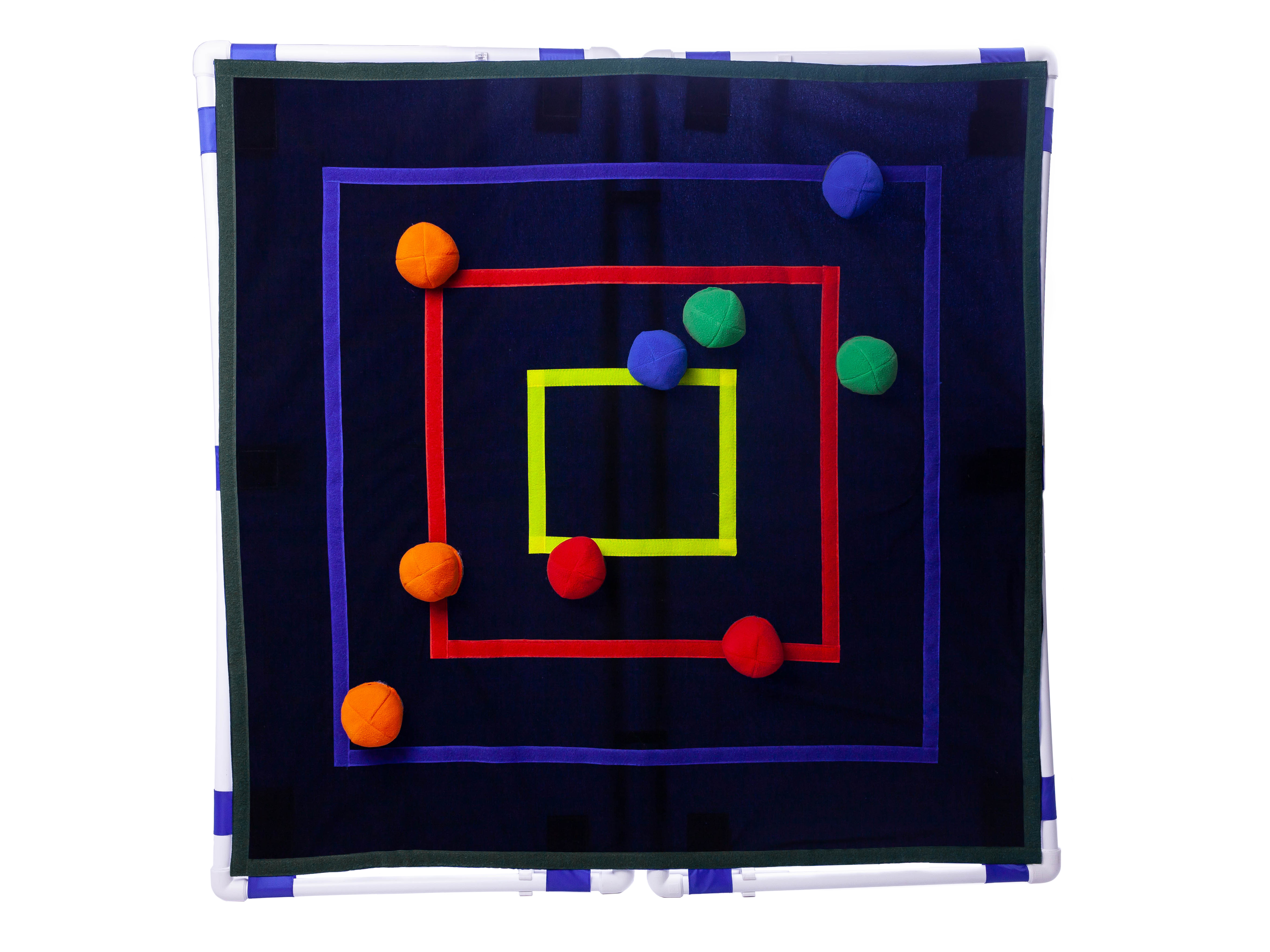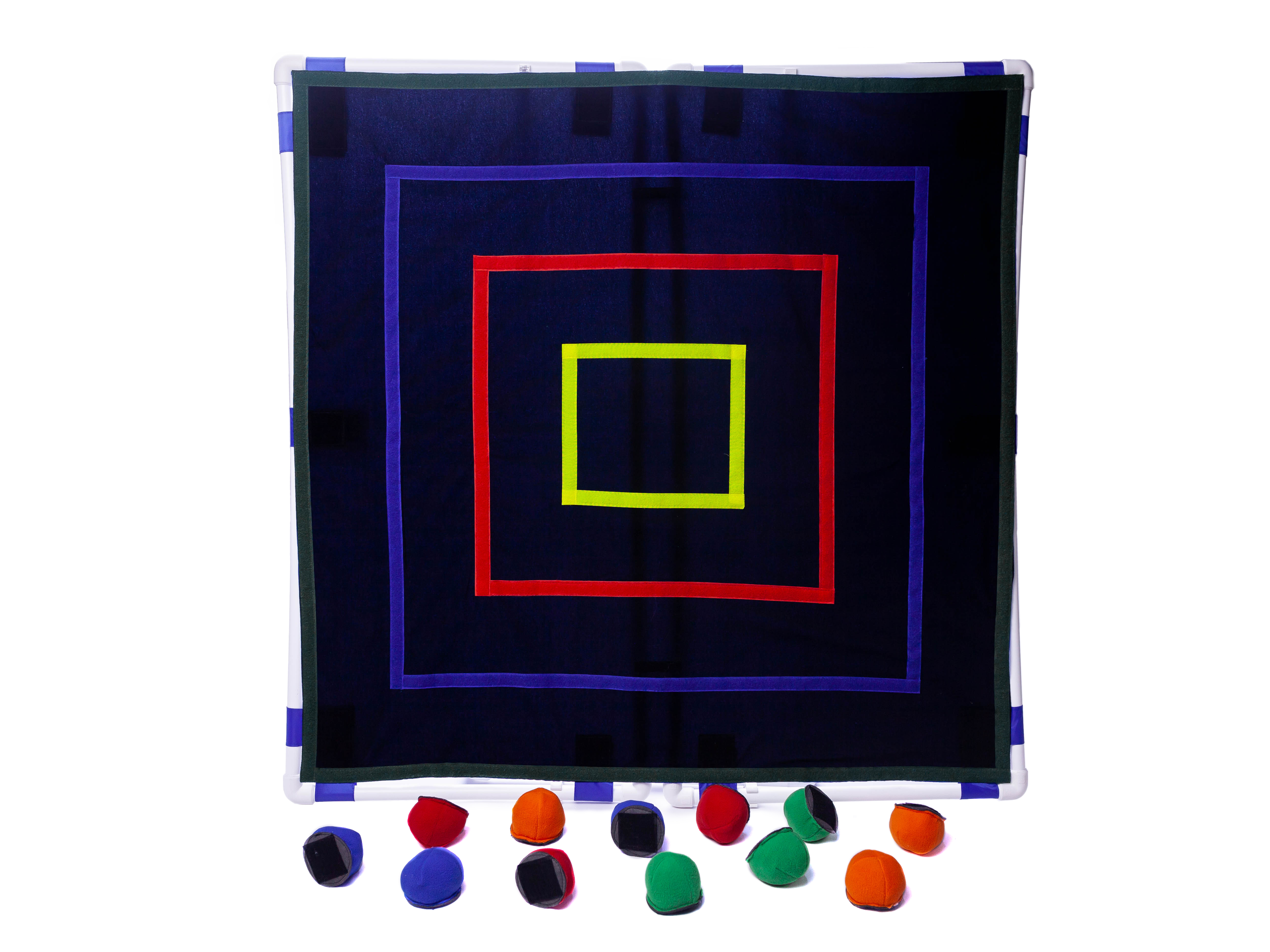Материал: рама из полипропиленовых труб , чехол  - оксфорд, ткань велькро - 100% полиэстер, мячики для дартса - флис, наполнитель синтечес - 100% полиэстер. Комплектация: 1 рама на подставке, 1 чехол, 15 конусов для дартса - синие, зеленые, красные, желтые и оранжевые по 3 штуки каждого цвета, сумка для хранения  застежка - кнопка. Размер: рама - 100х100 см, чехол - 100х100 см, шлевки 6х20см, мячики для дартса  - диаметр 7 см, высота 5, сумка для хранения - 32х38 см.  Упаковка - картонная коробка 105х55х15 см.