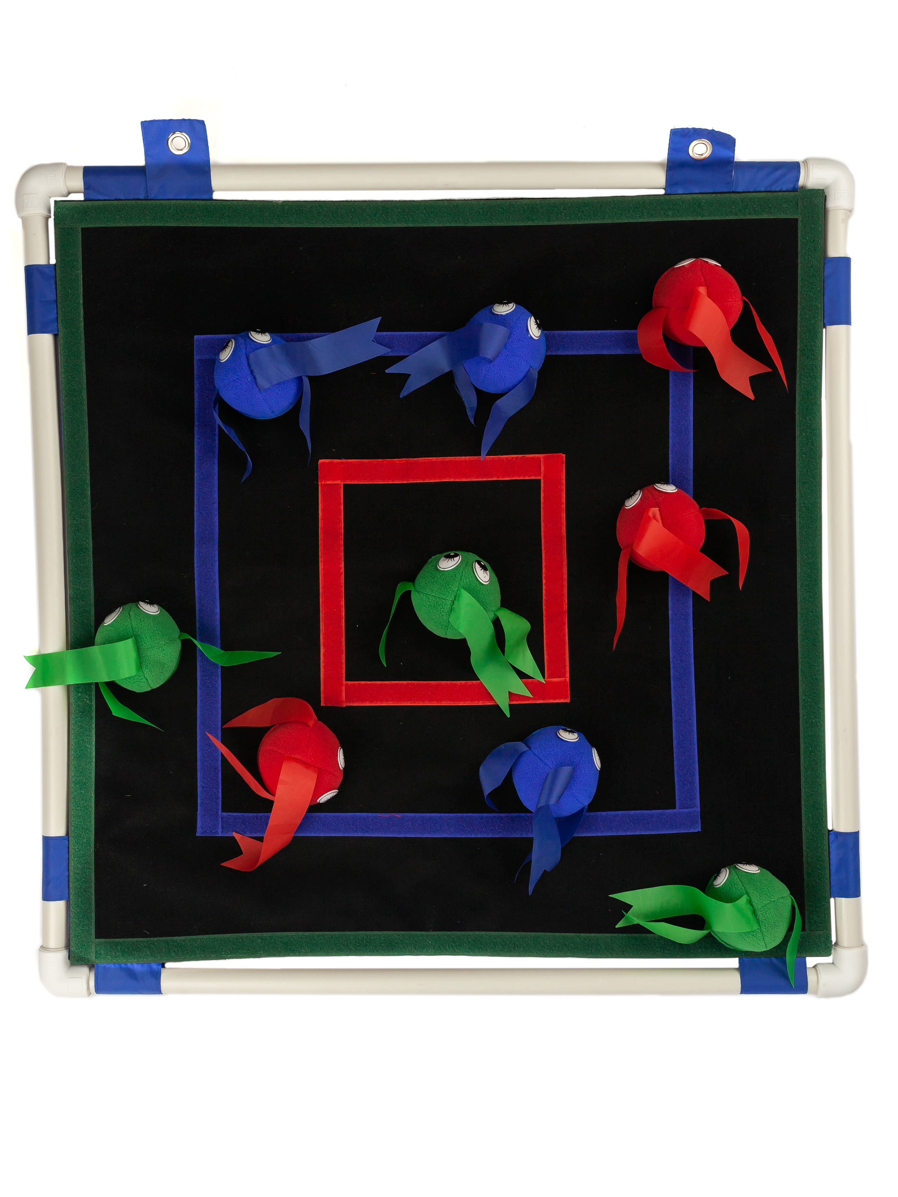 Материал: рама из полипропиленовых труб , чехол  - оксфорд, ткань велькро - 100% полиэстер, рыбки - флис, наполнитель синтечес - 100% полиэстер. Комплектация: 1 рама, 1 чехол, 9 рыбок - синяя, зеленая и красная, сумка для хранения  застежка - кнопка. Размер: рама - 60х60 см, чехол - 61х61 см, шлевки 6х20см, рыбки  - диаметр 7 см, высота 5 см, сумка  для хранения - 70х70 см.