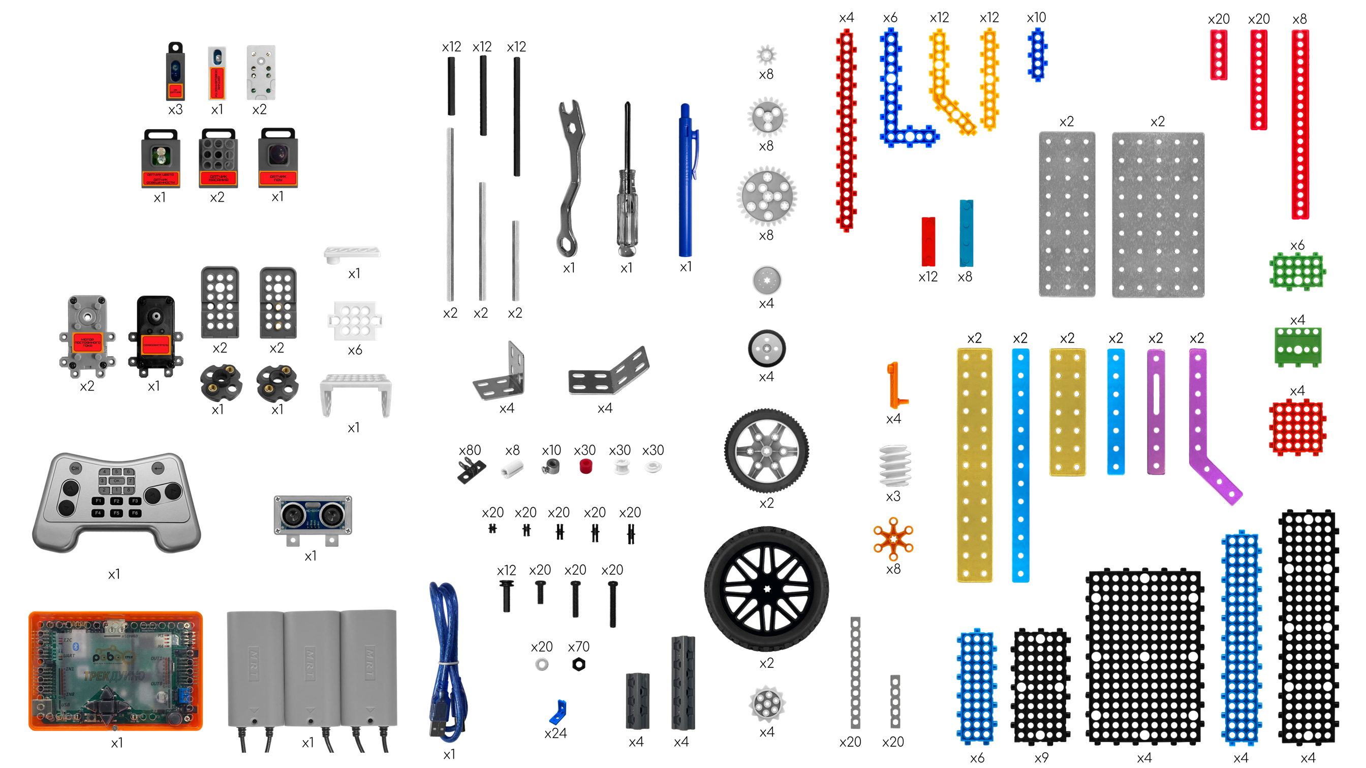 Элементы конструктора выполнены из прочного материала, их крепкий корпус можно применить в любом робототехническом проекте. В набор входят как пластиковые, так и металлические детали конструктора.