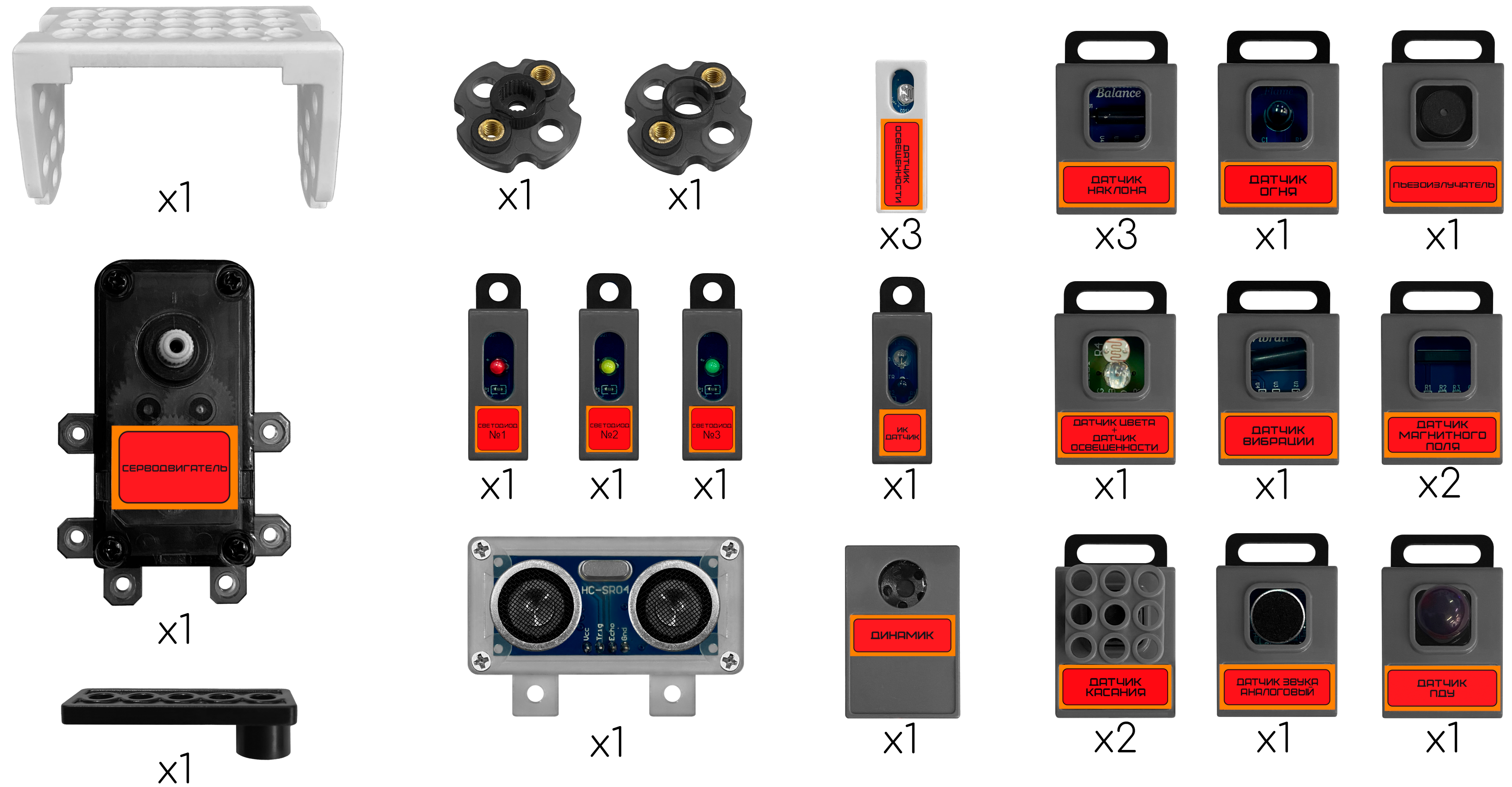 Светодиодные модули трех цветов- имеют полупроводниковый элемент, создающий оптическое излучение при пропускании через него электрического тока, чтобы обеспечивать индикацию о совершенном событии либо его отсутствии. Подключается к блоку управления через соединительный провод, имеет специальный корпус для возможности крепления с деталями конструктора .