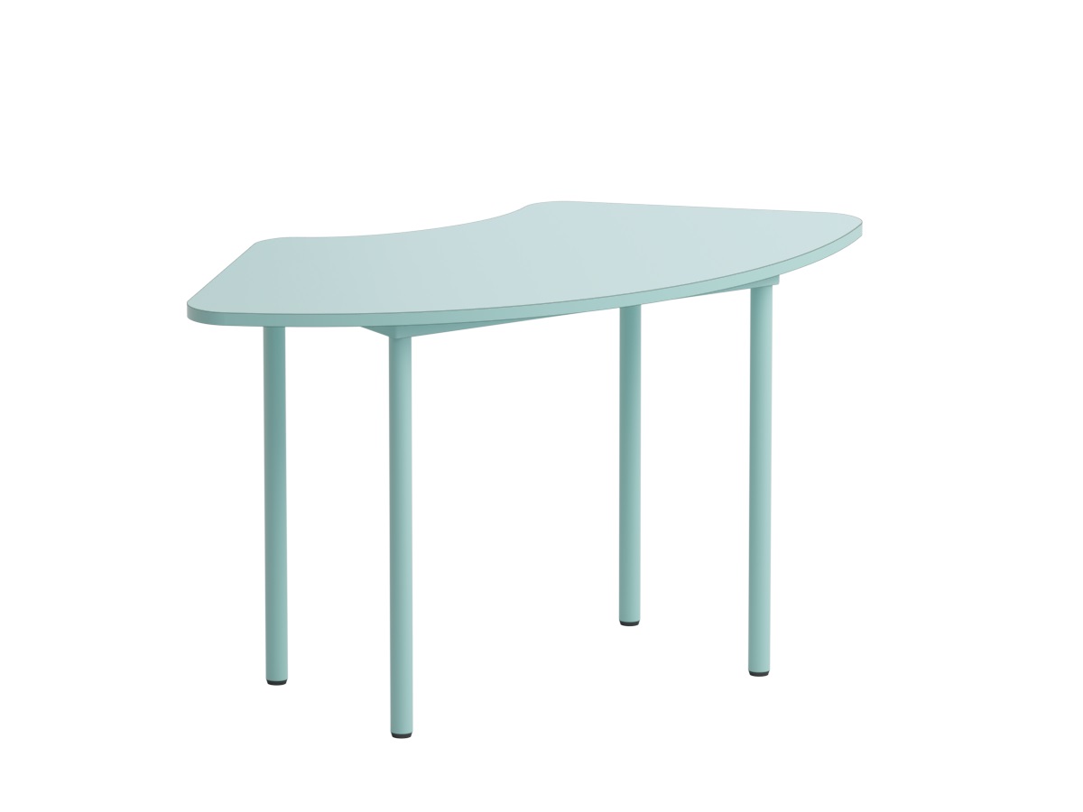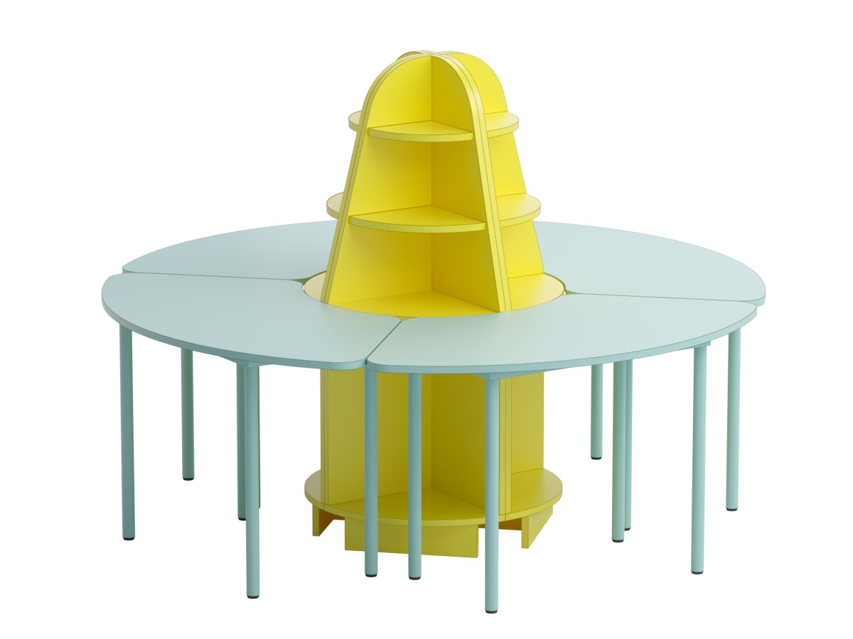 Дидактический набор мебели «Ромашка», собранный из четырёх угловых стоек и четырёх дидактических столов, представляет собой круговую композицию. Стойки скрепляются между собой межсекционными стяжками. Из набора мебели “Ромашка” можно делать разные комбинации, например: установить две стойки и два стола к стене или одну стойку и один стол в угол помещения. Стойки угловые изготовлены из ламинированной ДСП 16мм. Кромки щитовых элементов облицованы кромочным пластиком толщиной 2мм. Дидактический стол изготавливается на металлическом каркасе из стальных труб круглого сечения Ø32х2,0 и уголка сечением 25х25х1,5 с радиусной столешницей из плиты ДСП 16мм с ламинированным покрытием. Кромки столешницы облицованы кромочным пластиком толщиной 2 мм. Металлический каркас имеет сварную конструкцию со стойким порошковым полимерным покрытием. На свободных концах труб установлены заглушки из ударопрочных полимеров.