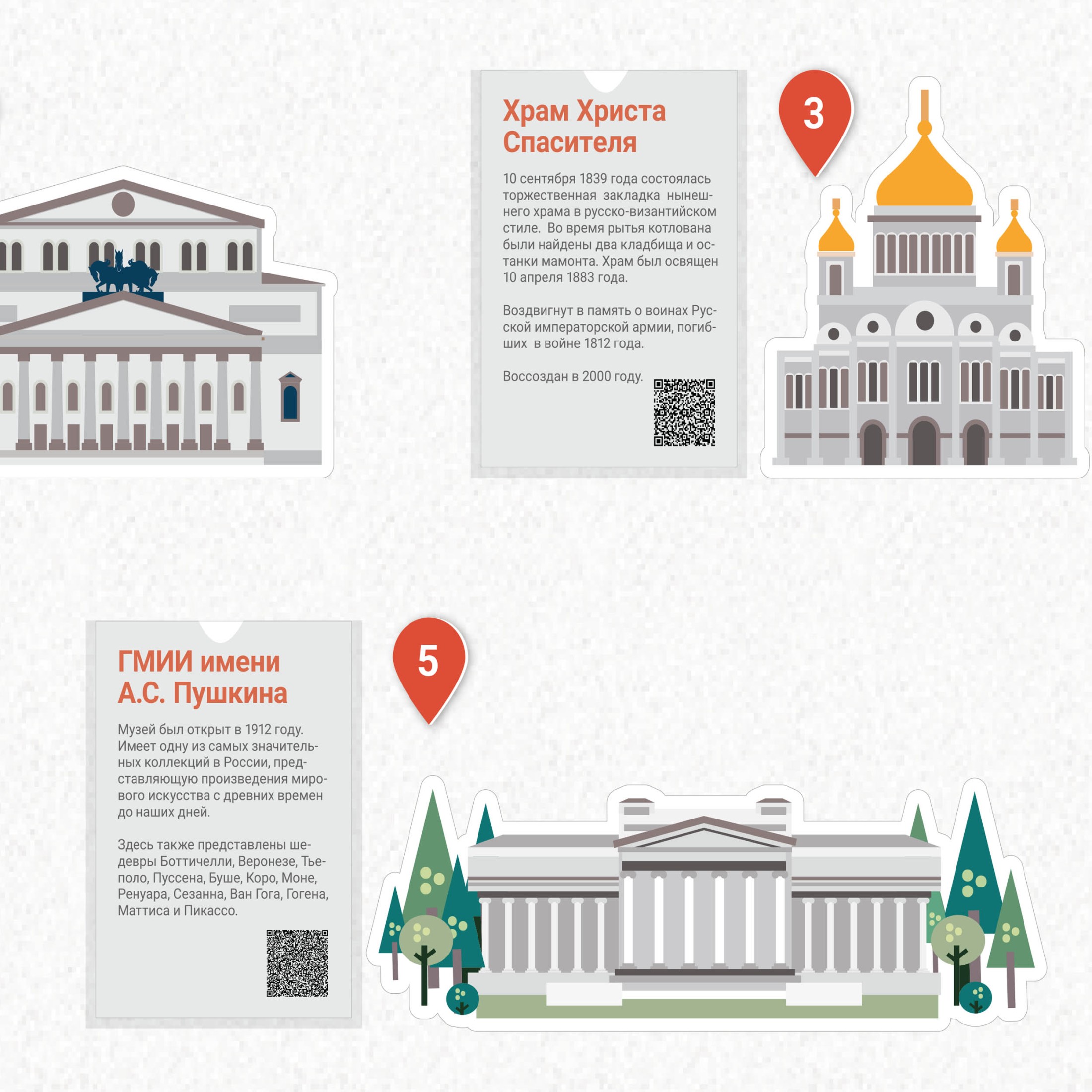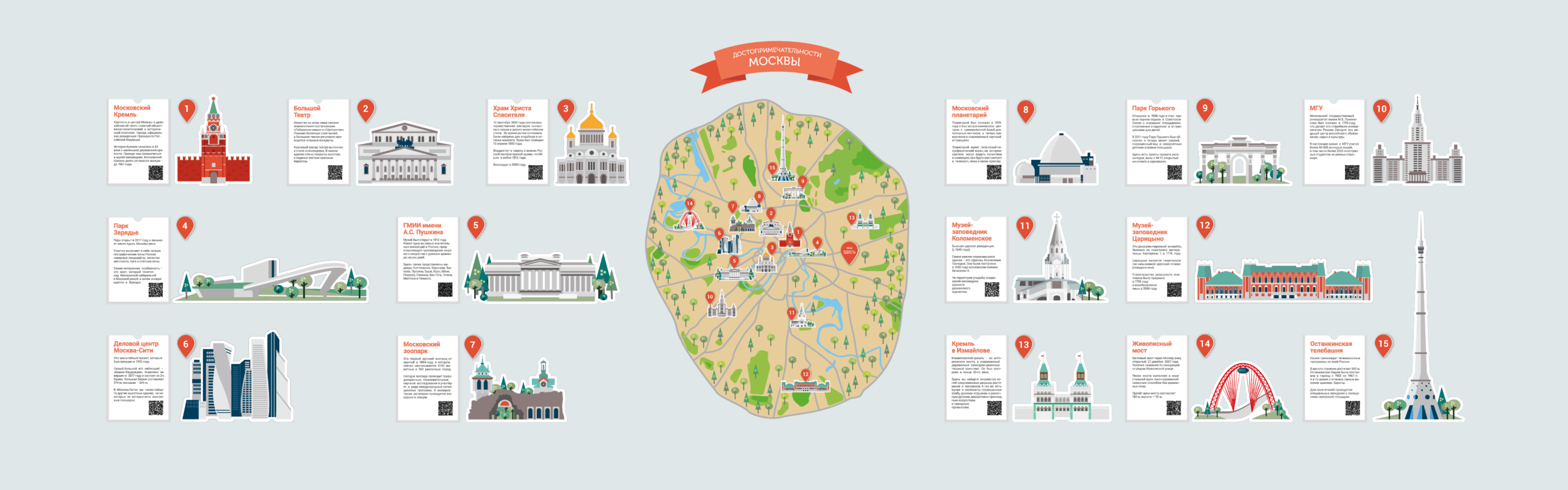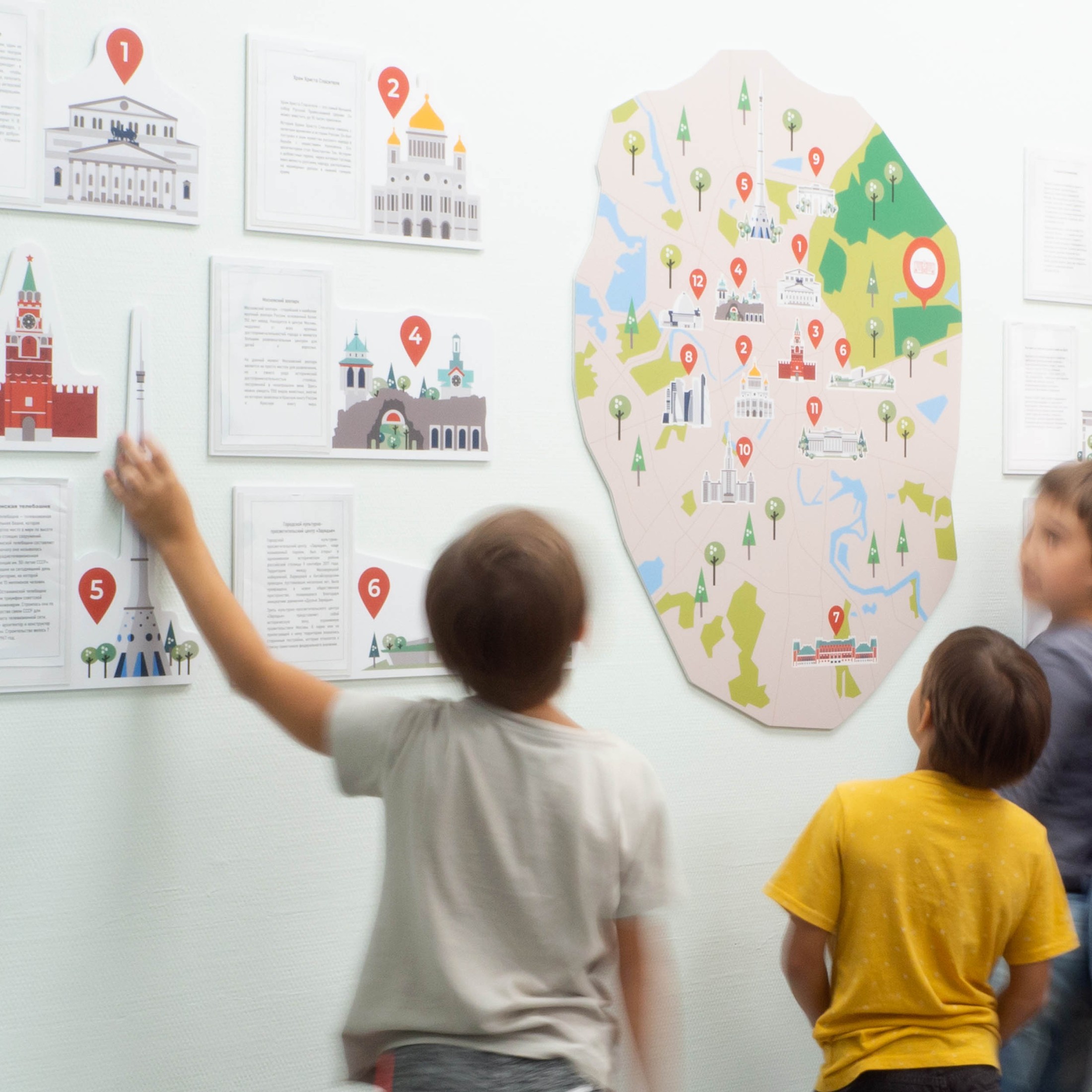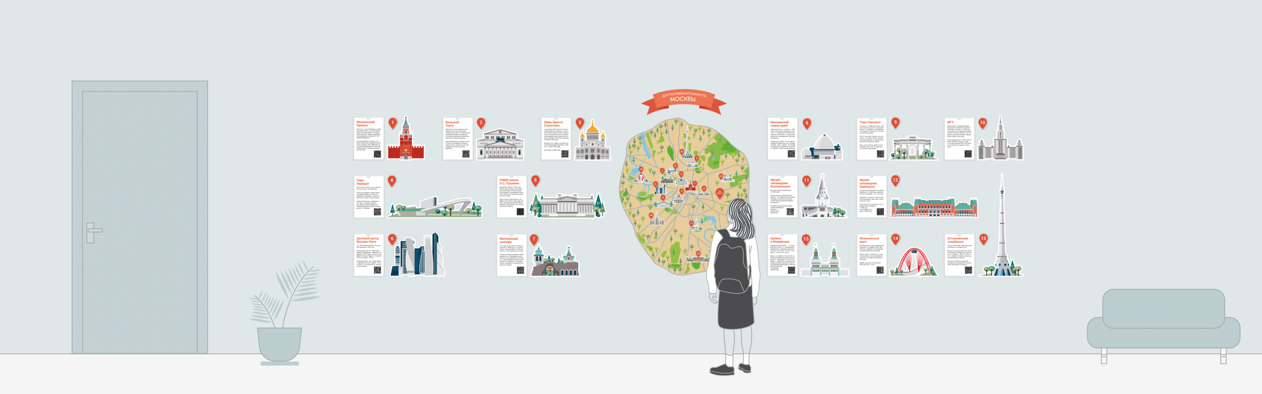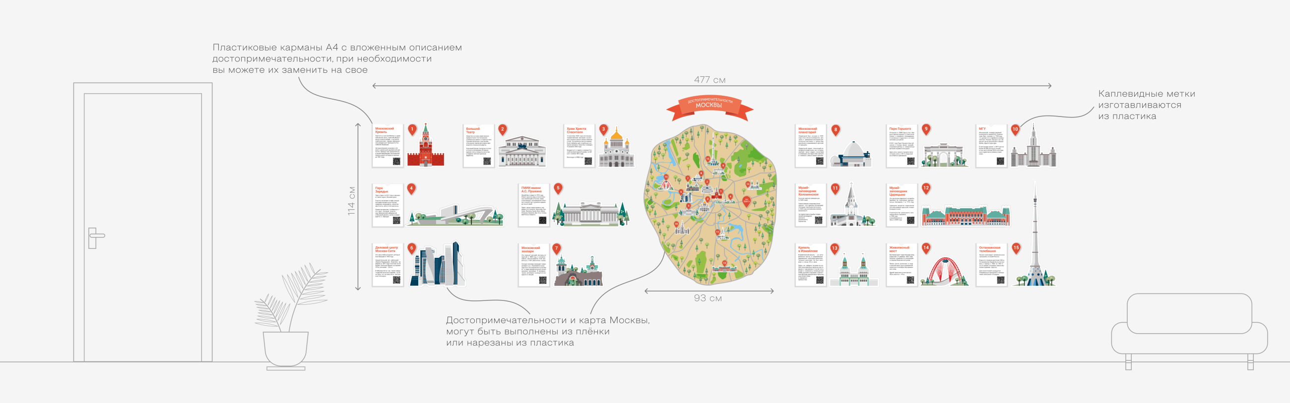Композиция на стены начальной школы – карта Москвы, с достопримечательностями и навигационными метками. Рядом  они  же, но побольше, с кратким описанием и  QR кодом на описание поподробнее, в кармашке А4. Сами описание вы по желанию можете менять.