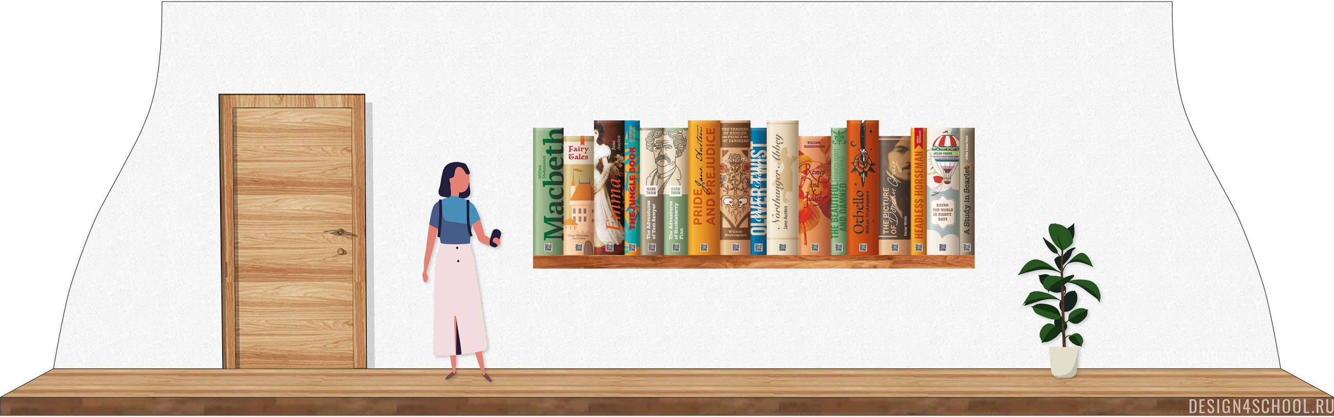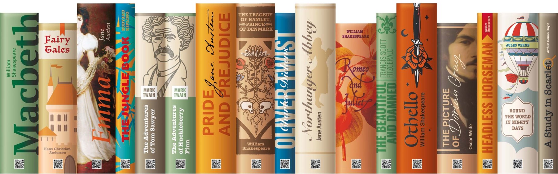 В полку входят изображения 17 книг классической английской литературы, являющихся общественным достоянием. На корешках книг размещены QR-коды для скачивания произведений из электронной библиотеки ЛитРес: Школа.