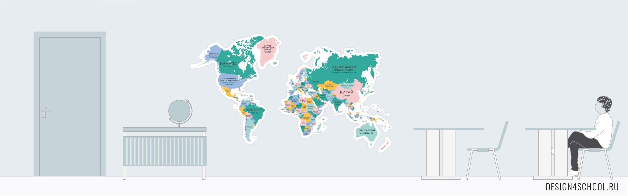 Карту можно использовать интерактивно: предложить ребятам проложить маршрут до моря, или отметить все страны на букву “М”, к примеру. Композиция предназначена для размещения в рекреации, большом коридоре школы.