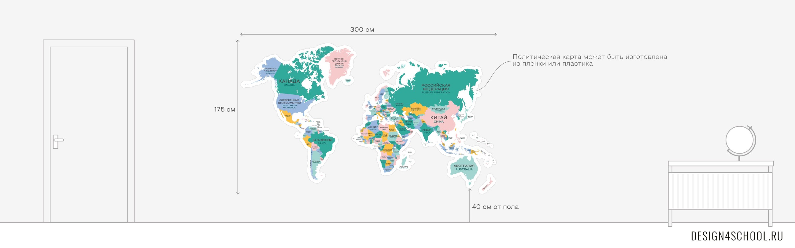 Карту можно использовать интерактивно: предложить ребятам проложить маршрут до моря, или отметить все страны на букву “М”, к примеру. Композиция предназначена для размещения в рекреации, большом коридоре школы.