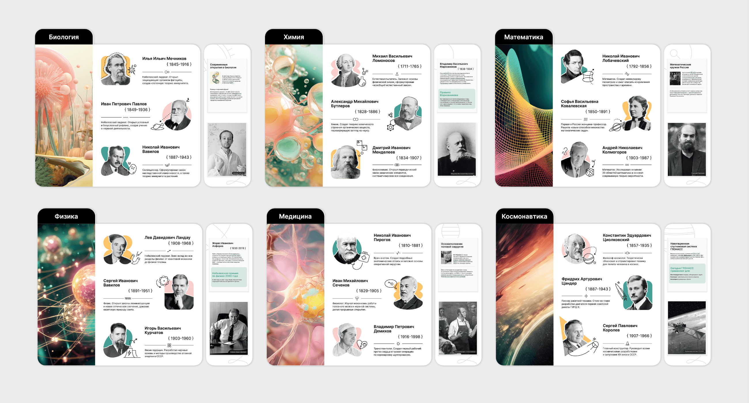 В этом готовом решении показаны 18 ученых и их прорывные изобретения в области биологии, химии, математики, физики и космонавтики. Графические изображения сгенерированы нейросетью – одной из самых передовых современных технологий.