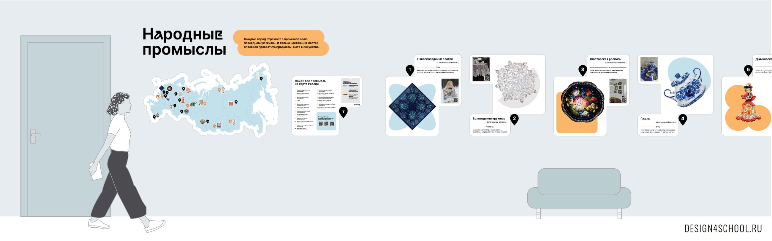 Всю серию готовых решений про Россию объединяют модульность с возможностью свободной компоновки в помещении любой площади, гармоничная цветовая гамма и легкий стиль повествования.