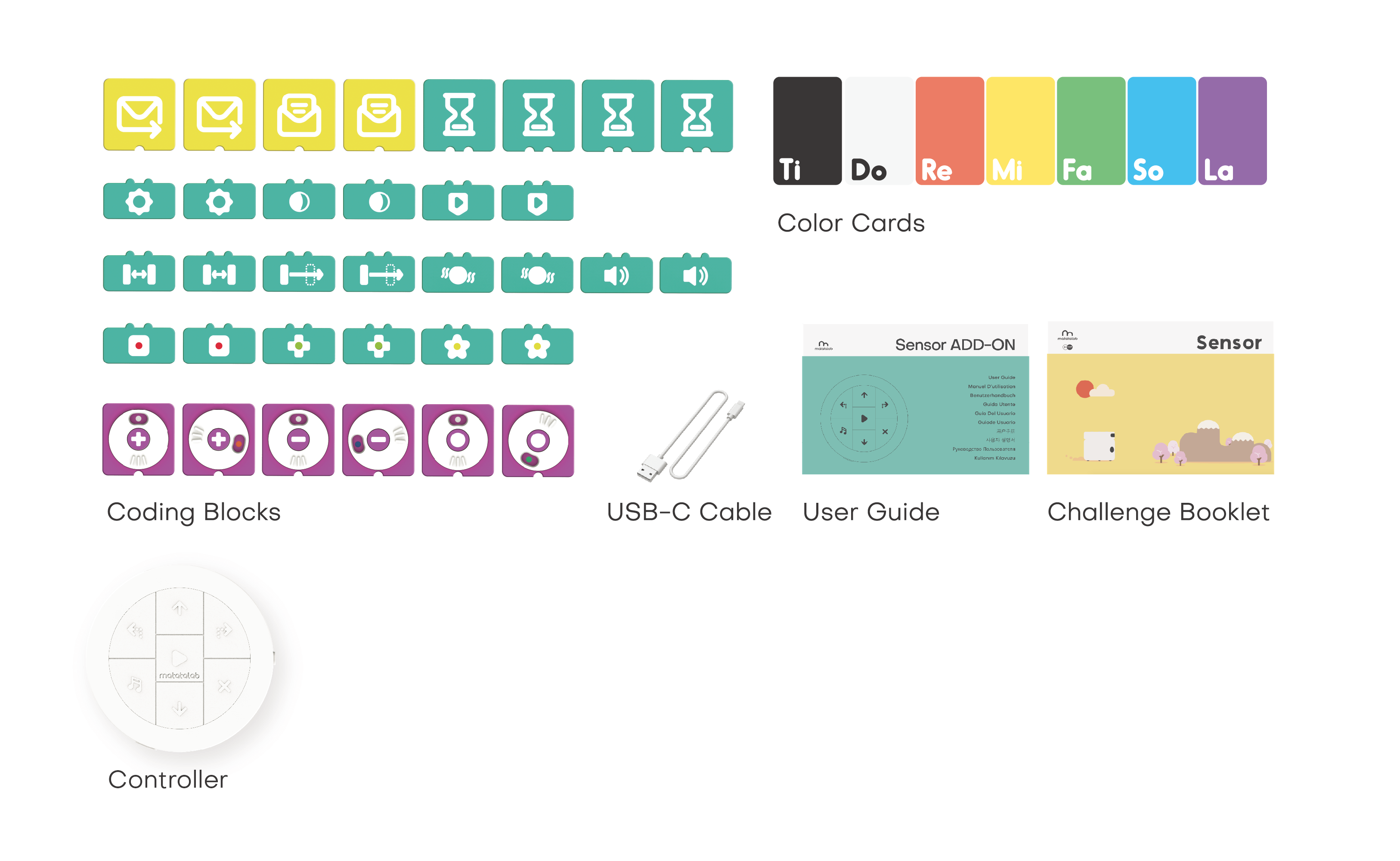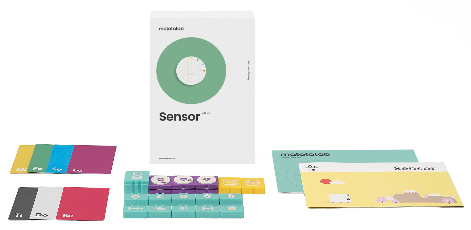 Набор состоит из блоков для программирования, Контроллера Matatalab со встроенными сенсорами и предназначен для расширения возможностей базового набора, например Matatalab Pro Set.