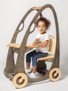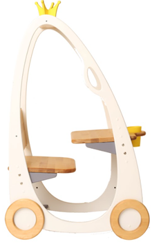 Мобильное рабочее место в виде транспортного средства (автомобиль с возможностью установки на крыше декоративного элемента (корона, мигалка, вертолет) с возможностью регулировки высоты сидения, а также регулировки высоты столешницы в диапазоне не менее трех ростовых групп 0-3, с возможностью дооснащения дополнительным оборудованием для слабослышащих и слабовидящих детей. Модель оснащена декоративными накладками в виде колес. Боковые стойки оснащены встроенными ручками, облегчающими посадку/высадку ребенка.