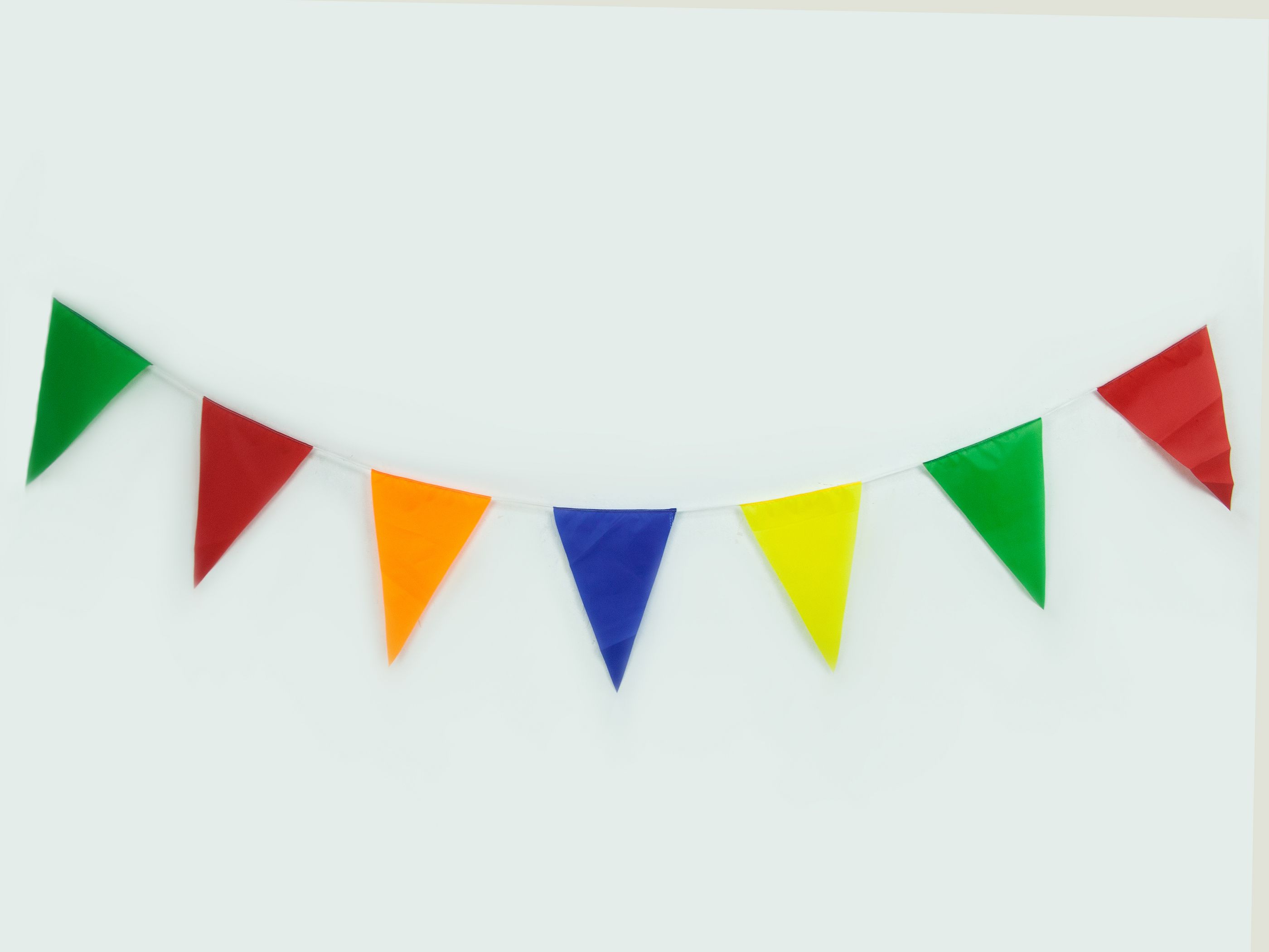 Флажная лента — это ряд треугольных разноцветных флажков (5 цветов – синий, красный, желтый, зеленый, оранжевый), пришитых к шнуру. 40 см шнура   с каждой стороны – завязки.