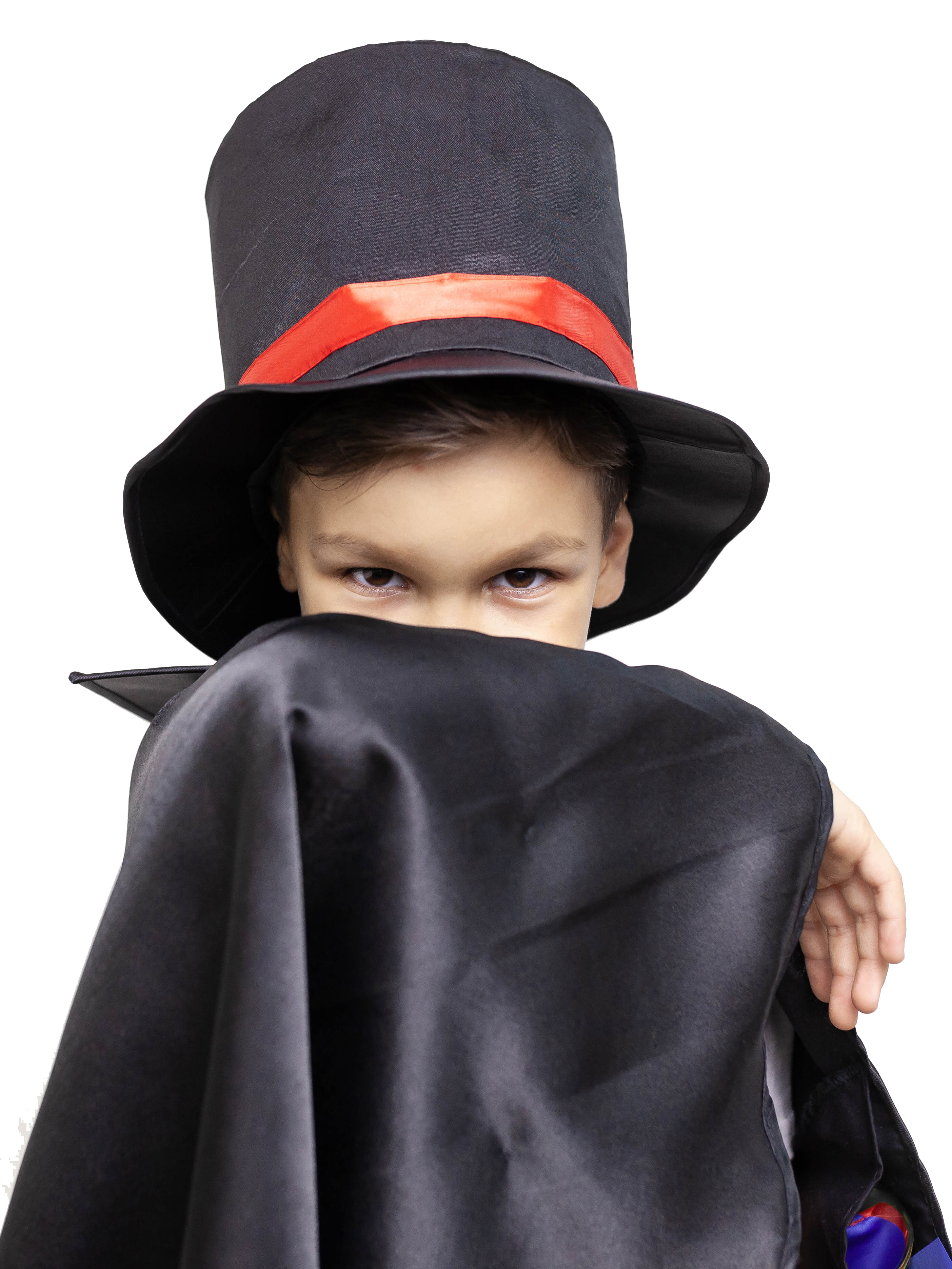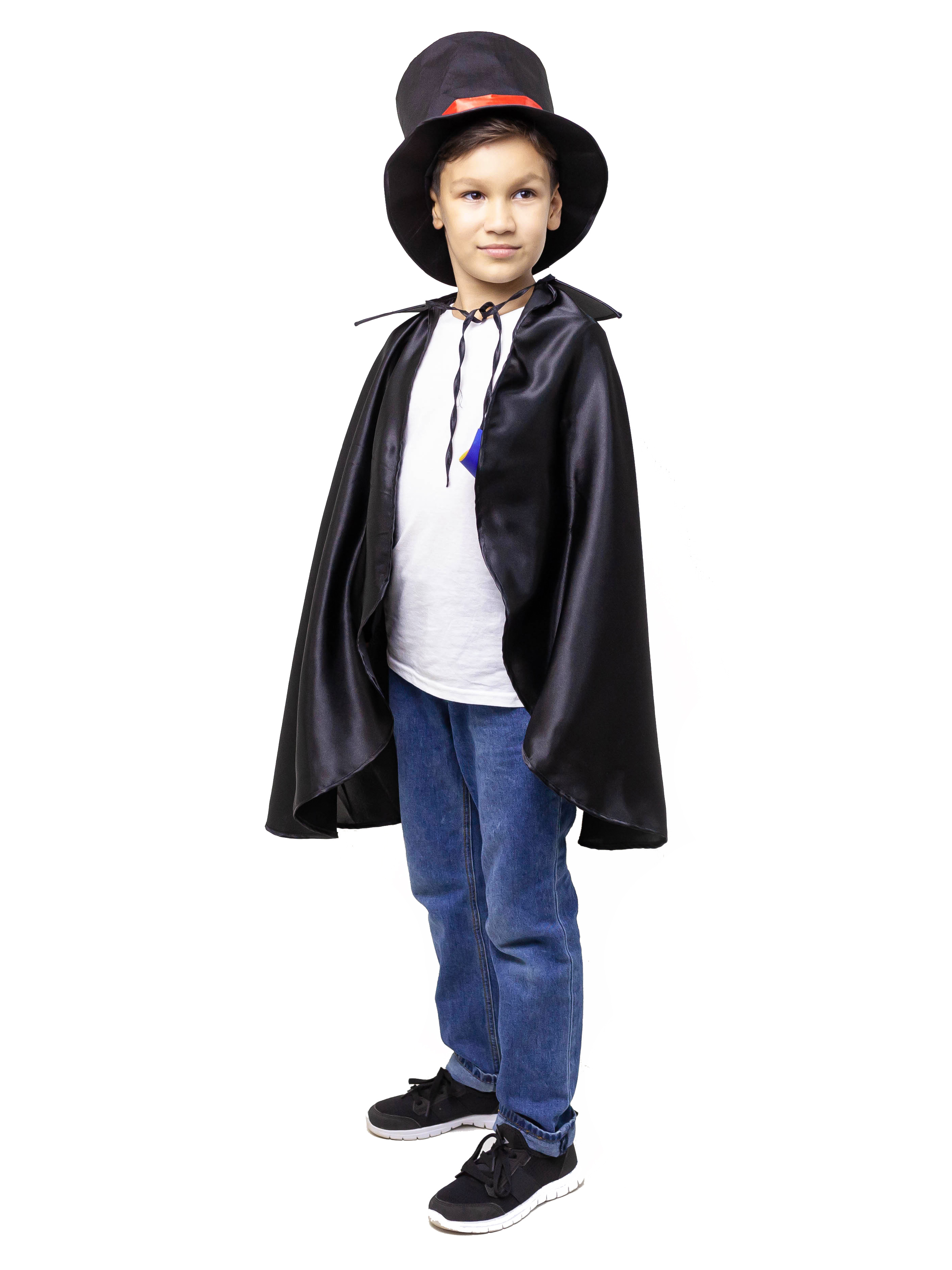 Материал: крепсатин - 100% полиэстер. Комплектация - плащ с воротником на завязках с потайными карманами, цилиндр с двойным дном. Размер:  длина плаща - 75 см, высота воротника 9 см, длина завязок 35 см, высота цилиндра - 16 см, диаметр 18 см, ширина тульи 5 см.
