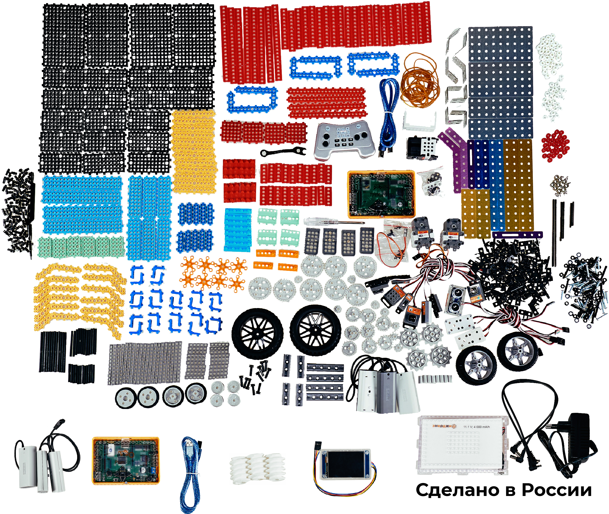 1. В состав набора входит 828 элементов. 1 материнская плата для продвинутого уровня, 2 двигателя постоянного тока, 1 сервомотор, 2 внешних энкодера, 6 видов датчиков. Пластиковые и металлические конструктивные блоки, балки и муфты. Возможность соединения блоков с 6 сторон позволяет создавать большие объемные конструкции за короткое время.