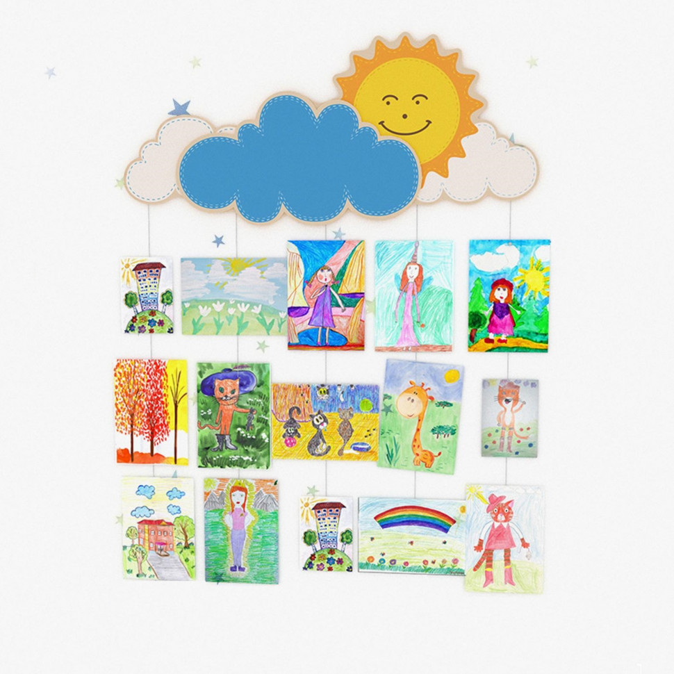 Демонстрационная система разработана для организации выставки детских работ, фотографий, размещения информации и методического материала. Дизайн демо системы украсит любой интерьер и создаст солнечное настроение. Тросы имеют утяжелители, а значит рисунки или информация будут висеть ровно и красиво. Крепление рисунков осуществляется с помощью прищепок. Материал : фанера, безопасный водорастворимый лак Размер : солнце - 112х50 см, трос - 150 см (5 шт)