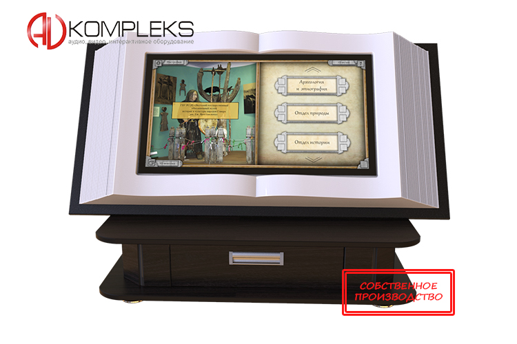 Мультимедийная интерактивная настольная книга «AVKompleks» – это оборудование, выпускаемое российской компанией «АВ Комплекс», в котором объединены интересный дизайн корпуса, повторяющий форму открытой книги и интерактивные технологии. Предназначено для установки в залах библиотек, музеях, выставочных комплексах, архивах, экспозициях, шоу-румах и местах, где посетителей знакомят с различной информацией. Корпус изготовлен из экологичного материала ЛДСП, в центре размещен сенсорный экран, поддерживающий до 10 одновременных касаний. В зависимости от пожеланий клиента, диагональ экрана составляет 24, 27, 32, 43 дюймов. Интерактивная система размещена на подставке с выдвижным ящиком, который используется для хранения совместимых устройств или других вещей.