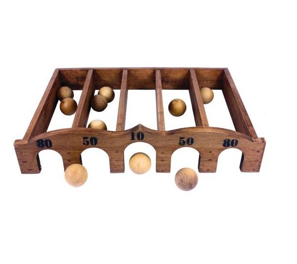 Универсальная игра на ловкость для развлечений или соревнований. Количество игроков не ограничено ни по количеству, ни по возрасту. Играть можно как на улице. так и в помещении, ведь места нужно не много - примерно 6х3 м. Правила игры : установите ворота и на расстоянии от 3 м до 5 м от них начертите линию старта. Ирга происходит по очереди, то есть каждый игрок должен забросить все 10 шаров один за другим в калитки, стараясь конечно попасть в те, которые дадут наибольшее количество очков. Шары, не попавшие в калитки, не приносят игроку очков, но можно следующим ударом постараться забить этот шар в калитку. Победителем в игре станет тот, кто наберет наибольшее количество очков. Размеры: 76х57х29 см Комплектация: 10 шаров диаметром 60 мм, 1 основа для игры - ворота. Материал : массив дерева, фанера, покрытие - морилка, акриловый лак