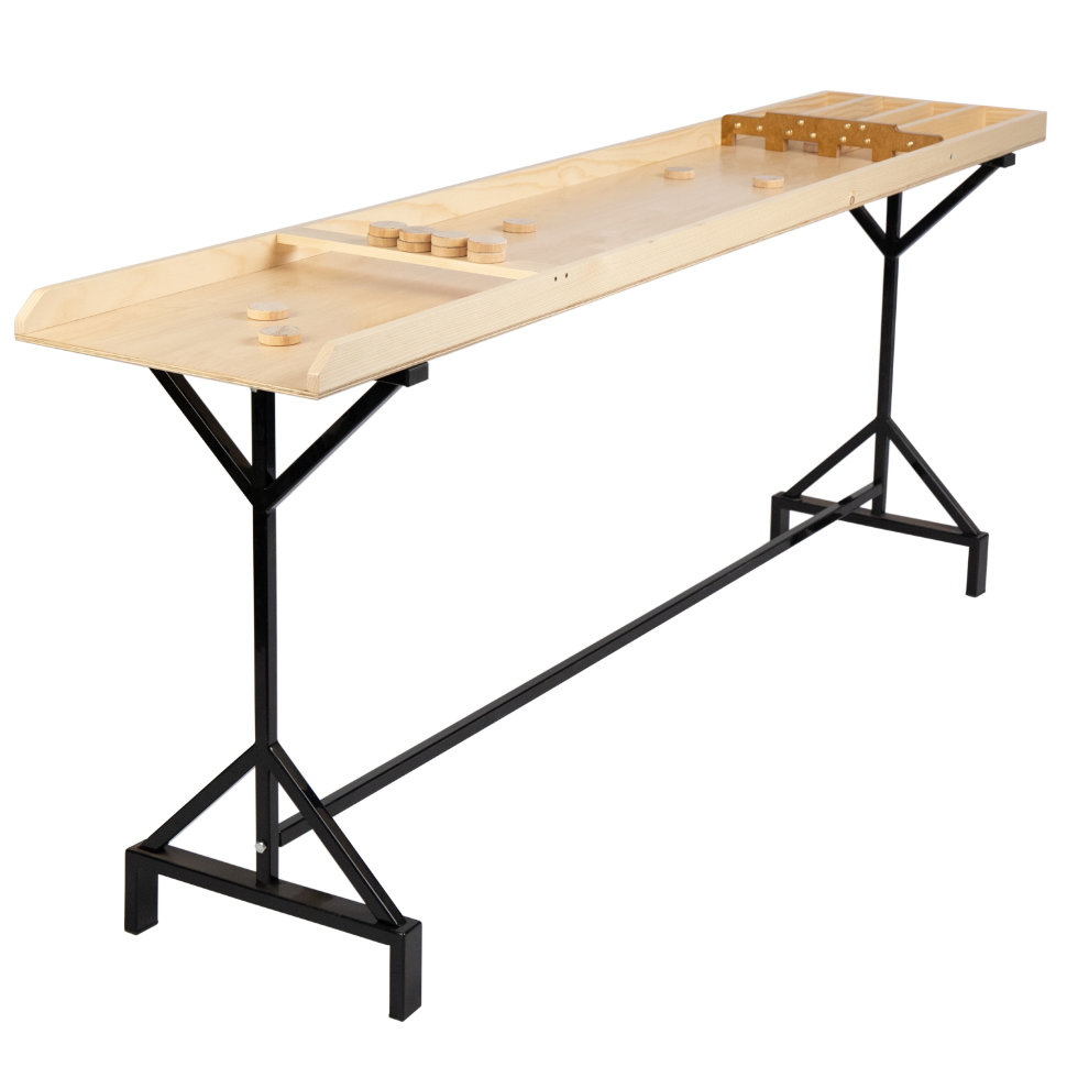 Игра, известная нам под названием «Жульбак», является голландской разновидностью британской игры Шаффлборд. Свой современный вид «Жульбак» приобрел в Голландии в XVIII веке. В нее играли киями, пытаясь закатить шайбы в лузы на деревянной доске. В Германии ее стали называть «Джакколо», в Англии – «Датский Шаффборд". Сейчас "Джакколо - Жульбак" стал на столько популярен по всему миру, что по нему проводятся соревнования и турниры. Цель игры — забить 30 деревянных шайб в лузы и набрать наибольшее количество очков. Правила игры : Количество игроков не ограниченно. Играют по очереди, каждому игроку дается 3 попытки забить все 30 шайб в лузы. Каждая луза дает разное количество очков слева направо : первая – 2 очка, вторая – 3 очка, третья -4 очка, четвёртая – 1 очко. Если с первой попытки забиты не все шайбы, то отскочившие шайбы перебрасываются. Если в ходе попытки игрок смог забить в каждую из луз по шайбе, то победные очки за каждый такой комплект удваиваются. Пример подсчета очков при условии, что в каждой лузе есть по 1 шайбе: (2+3+4+1) *2=20 очков. Соответственно, если игроку удалось забить в каждую лузу по 3 шайбы, ему начисляется 3*20=60 победных очков. В конце каждой попытки шайбы в лузах складываются в стопку так, чтобы они не мешали залетать в лузу другим шайбам. Если все шайбы забиты с первой попытки, игрок получает для броска две дополнительные шайбы Если все шайбы забиты со второй попытки, игрок получает для броска одну дополнительную шайбу Комплектация : игровое поле (борта из ясеня) - 1 шт, подстолье металлическое - 1 шт, фишки из дуба без лака- 30 шт Размеры : общие 200х44х6 см, игровое поле 198х39.5 см Материалы : массив дерева, фанера, металл, пластик, покрытие - акриловый лак