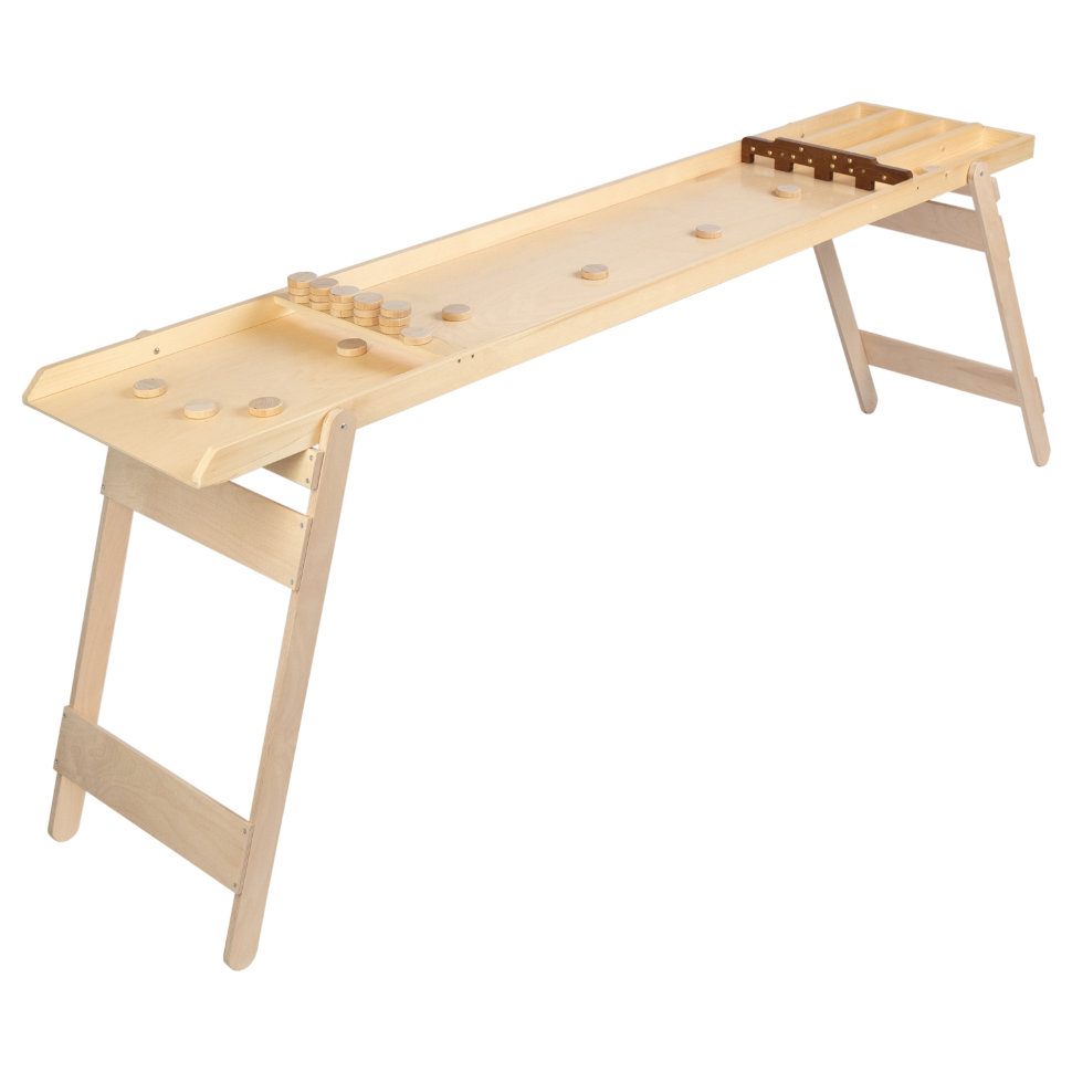 Игра, известная нам под названием «Жульбак», является голландской разновидностью британской игры Шаффлборд. Свой современный вид «Жульбак» приобрел в Голландии в XVIII веке. В нее играли киями, пытаясь закатить шайбы в лузы на деревянной доске. В Германии ее стали называть «Джакколо», в Англии – «Датский Шаффборд". Сейчас "Джакколо - Жульбак" стал на столько популярен по всему миру, что по нему проводятся соревнования и турниры. Цель игры — забить 30 деревянных шайб в лузы и набрать наибольшее количество очков. Правила игры : Количество игроков не ограниченно. Играют по очереди, каждому игроку дается 3 попытки забить все 30 шайб в лузы. Каждая луза дает разное количество очков слева направо : первая – 2 очка, вторая – 3 очка, третья -4 очка, четвёртая – 1 очко. Если с первой попытки забиты не все шайбы, то отскочившие шайбы перебрасываются. Если в ходе попытки игрок смог забить в каждую из луз по шайбе, то победные очки за каждый такой комплект удваиваются. Пример подсчета очков при условии, что в каждой лузе есть по 1 шайбе: (2+3+4+1) *2=20 очков. Соответственно, если игроку удалось забить в каждую лузу по 3 шайбы, ему начисляется 3*20=60 победных очков. В конце каждой попытки шайбы в лузах складываются в стопку так, чтобы они не мешали залетать в лузу другим шайбам. Если все шайбы забиты с первой попытки, игрок получает для броска две дополнительные шайбы Если все шайбы забиты со второй попытки, игрок получает для броска одну дополнительную шайбу Комплектация : игровое поле (борта из сосны) - 1 шт, подстолье складное - 1 комплект, фишки из дуба без лака- 30 шт Размеры : общие 200х44х6 см, игровое поле 198х39.5 см Материалы : массив дерева, фанера, металл, пластик, покрытие - акриловый лак