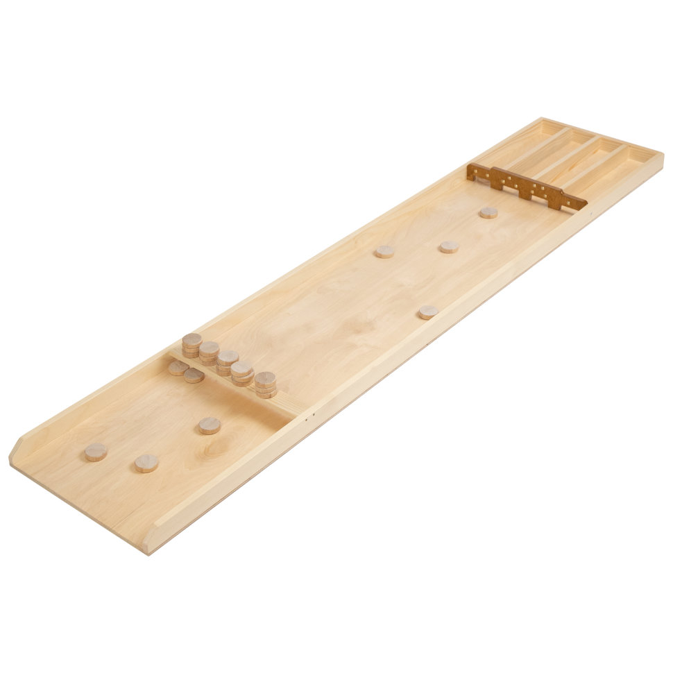 Игра, известная нам под названием «Жульбак», является голландской разновидностью британской игры Шаффлборд. Свой современный вид «Жульбак» приобрел в Голландии в XVIII веке. В нее играли киями, пытаясь закатить шайбы в лузы на деревянной доске. В Германии ее стали называть «Джакколо», в Англии – «Датский Шаффборд". Сейчас "Джакколо - Жульбак" стал на столько популярен по всему миру, что по нему проводятся соревнования и турниры. Цель игры — забить 30 деревянных шайб в лузы и набрать наибольшее количество очков. Правила игры : Количество игроков не ограниченно. Играют по очереди, каждому игроку дается 3 попытки забить все 30 шайб в лузы. Каждая луза дает разное количество очков слева направо : первая – 2 очка, вторая – 3 очка, третья -4 очка, четвёртая – 1 очко. Если с первой попытки забиты не все шайбы, то отскочившие шайбы перебрасываются. Если в ходе попытки игрок смог забить в каждую из луз по шайбе, то победные очки за каждый такой комплект удваиваются. Пример подсчета очков при условии, что в каждой лузе есть по 1 шайбе: (2+3+4+1) *2=20 очков. Соответственно, если игроку удалось забить в каждую лузу по 3 шайбы, ему начисляется 3*20=60 победных очков. В конце каждой попытки шайбы в лузах складываются в стопку так, чтобы они не мешали залетать в лузу другим шайбам. Если все шайбы забиты с первой попытки, игрок получает для броска две дополнительные шайбы Если все шайбы забиты со второй попытки, игрок получает для броска одну дополнительную шайбу Комплектация : игровое поле (борта из ясеня) - 1 шт, фишки дуб без лака- 30 шт Размеры : общие 200х44х6 см, игровое поле 198х39.5 см Материалы : массив дерева, фанера, покрытие - акриловый лак