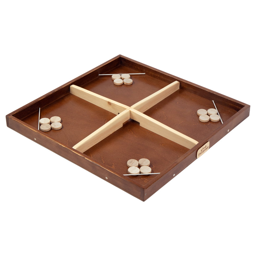 Увлекательная и азартная игра для 2 или 4 человек. Задача игрока с помощью эластичной резинки все фишки из своей зоны перебросить через отверстия посередине игрового поля в зоны соперников. Очередности ходов нет, так как игра на скорость, поэтому побеждает тот, кто быстрее останется без фишек. Варианты игры: 2 игрока: Каждый игрок одновременно играет в двух зонах правой и левой рукой (в каждой зоне 4 фишки). Задача с помощью резинок освободить обе зоны от фишек или по команде "Стоп" побеждает тот, в чьих зонах меньше фишек. 4 игрока: У каждого игрока своя зона и задача освободить свою зону от фишек. Игрок, который освободил свою зону от фишек, дает команду "Стоп". Он становится победителем, а остальные места распределяются по количеству фишек в зоне. Комплектация : игровое поле - 1 шт, фишки - 16 шт Размер : 75х75х6 см Материал : массив дерева, фанера, покрытие - морилка, акриловый лак