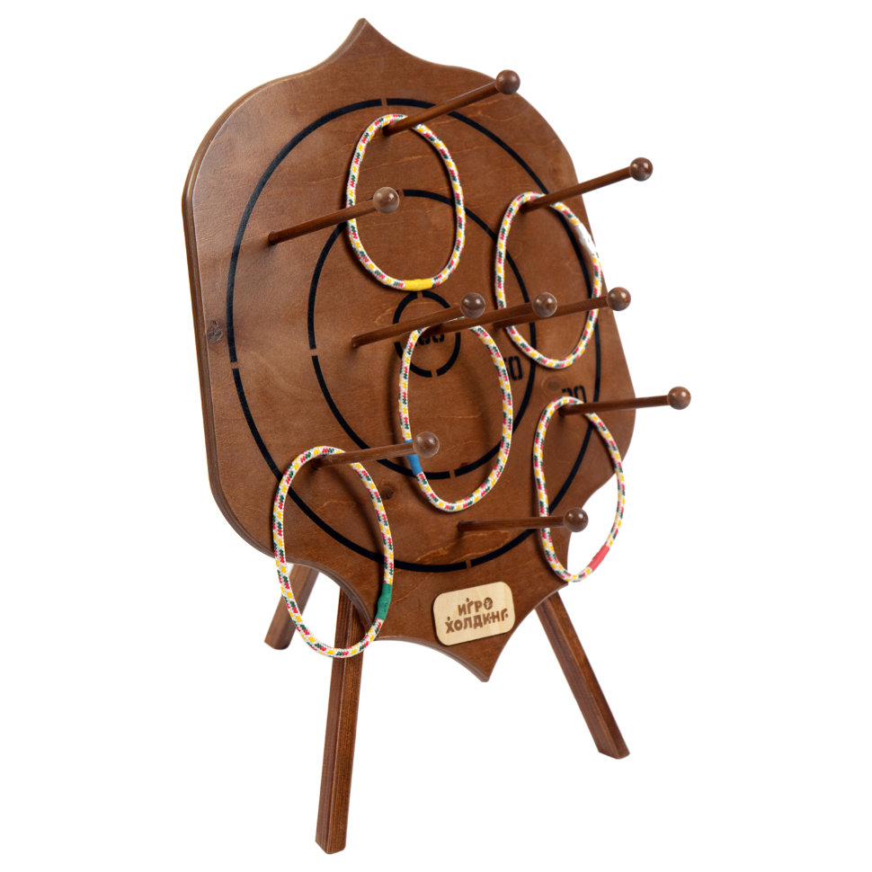 «Кольцеброс Геральд» – старинная соревновательная игра, проверяющая вашу меткость, ловкость и точность движений. Одна из самых популярных забав на ярмарочных или других народных гуляньях. Устроена просто: есть 10 колец и цель, на которую их накидывают. Кто попадет – тот молодец, а победитель определяется по количеству очков. Количество игроков не ограничено. Размер: 59х48х56 см Комплектация : 1 мишень, 10 колец Материалы : массив дерева, фанера, веревка,покрытие - морилка, акриловый лак