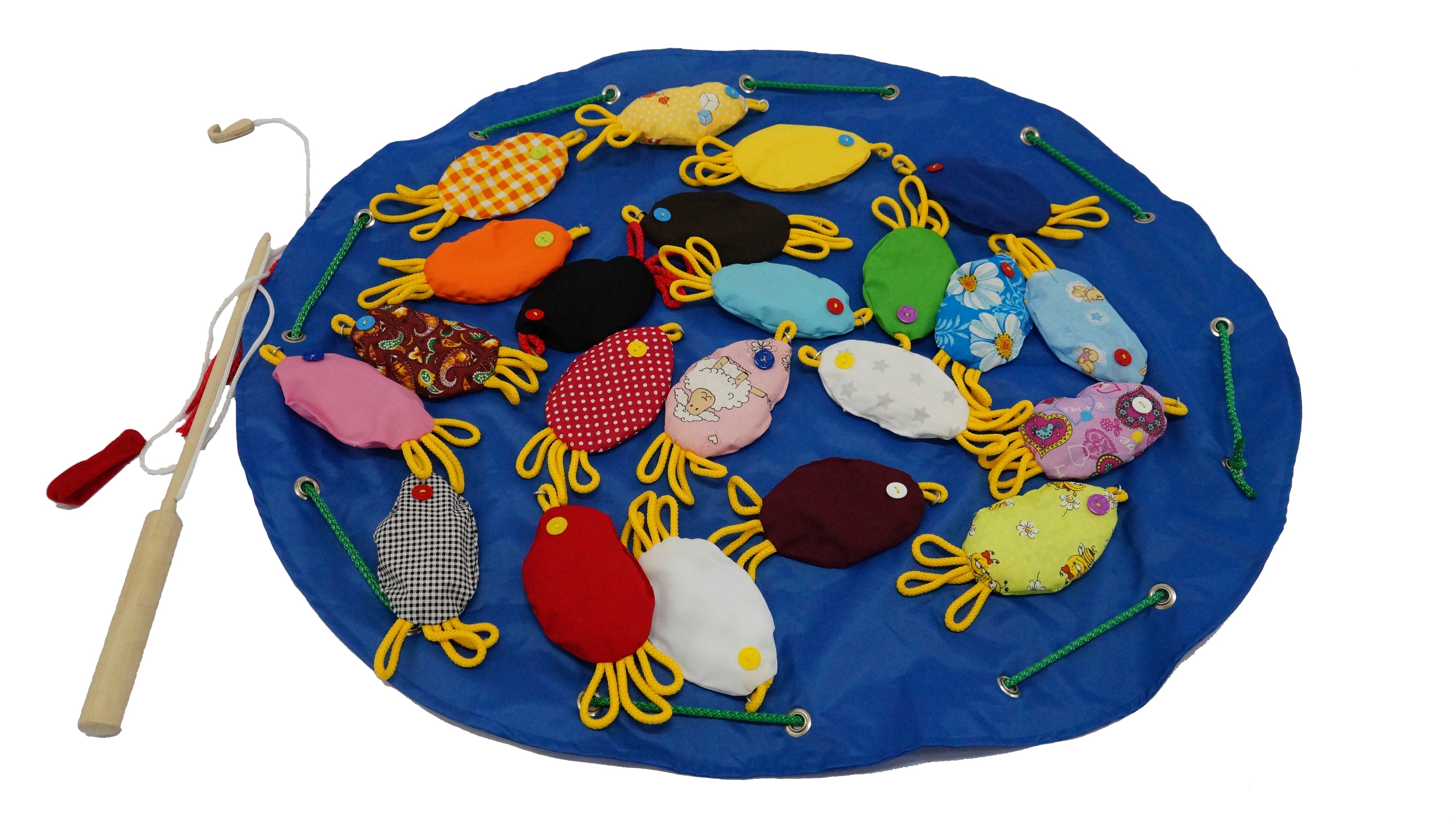 Комплектация: рыбки — всего 16 штук сортировка по цвету и по наполнению (8 пар),Мешок – пруд – 1 штука, 2 удочки, 2 червячка, 2 кукана, заплечный мешок.