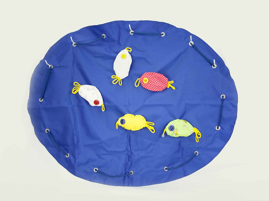 Материал: рыбки — хлопок 100%, шнур — полиэстер 100%, удочки — дерево, червячки — тафетта, 2 магнита, пруд — оксфорд — 100% полиэстер, заплечный мешок — смесовая ткань 35% хлопка, 65% полиэстера.