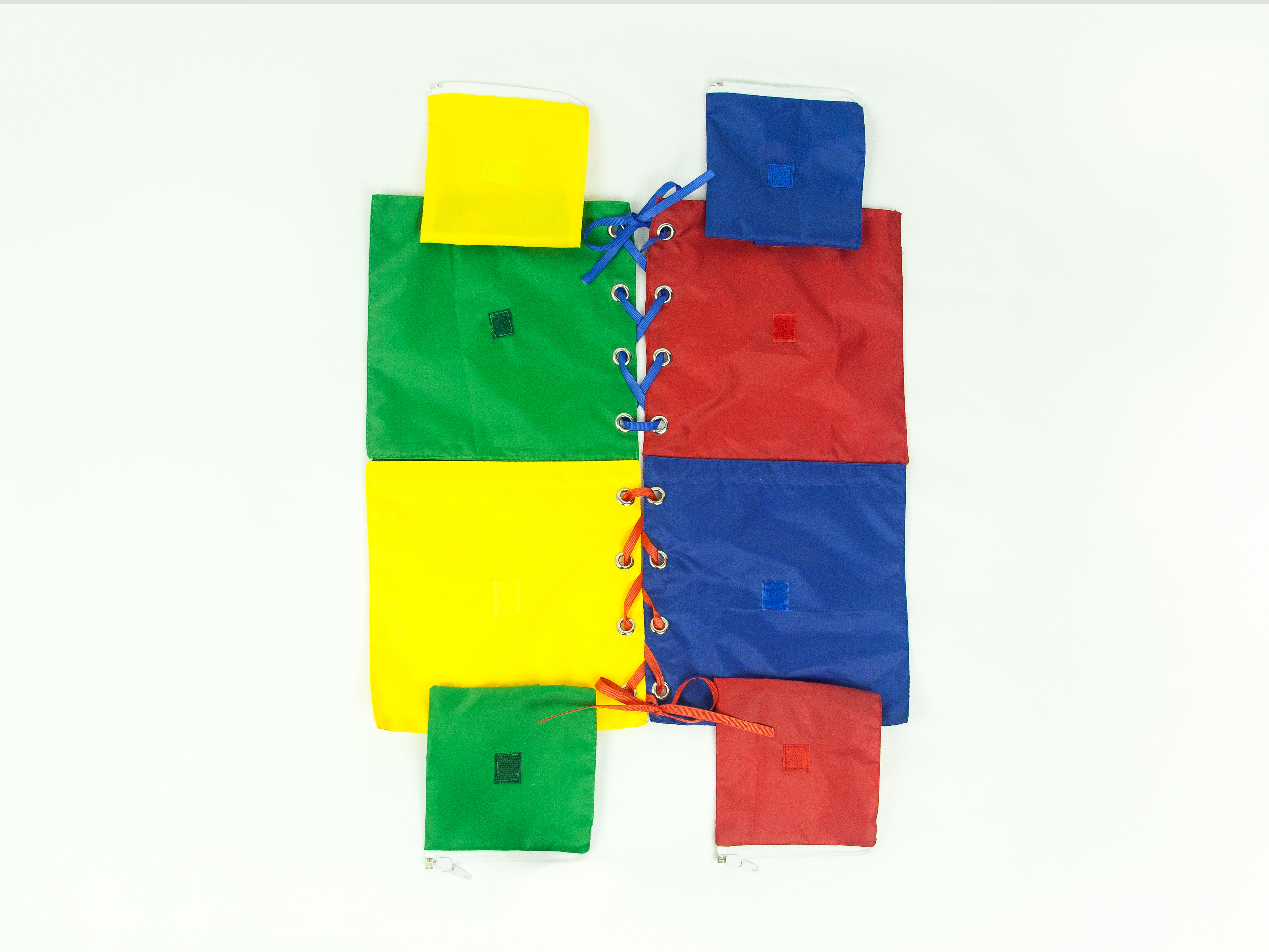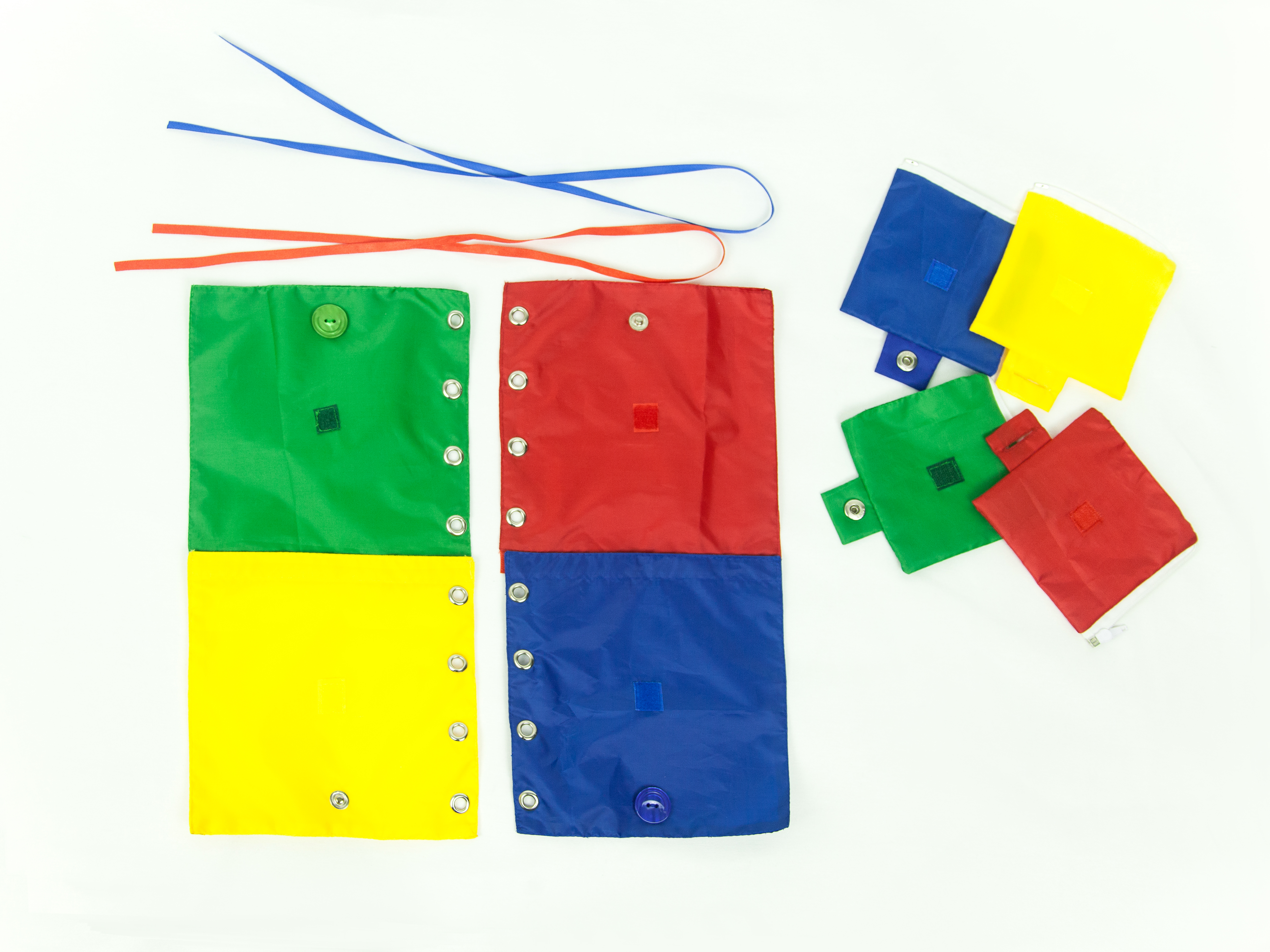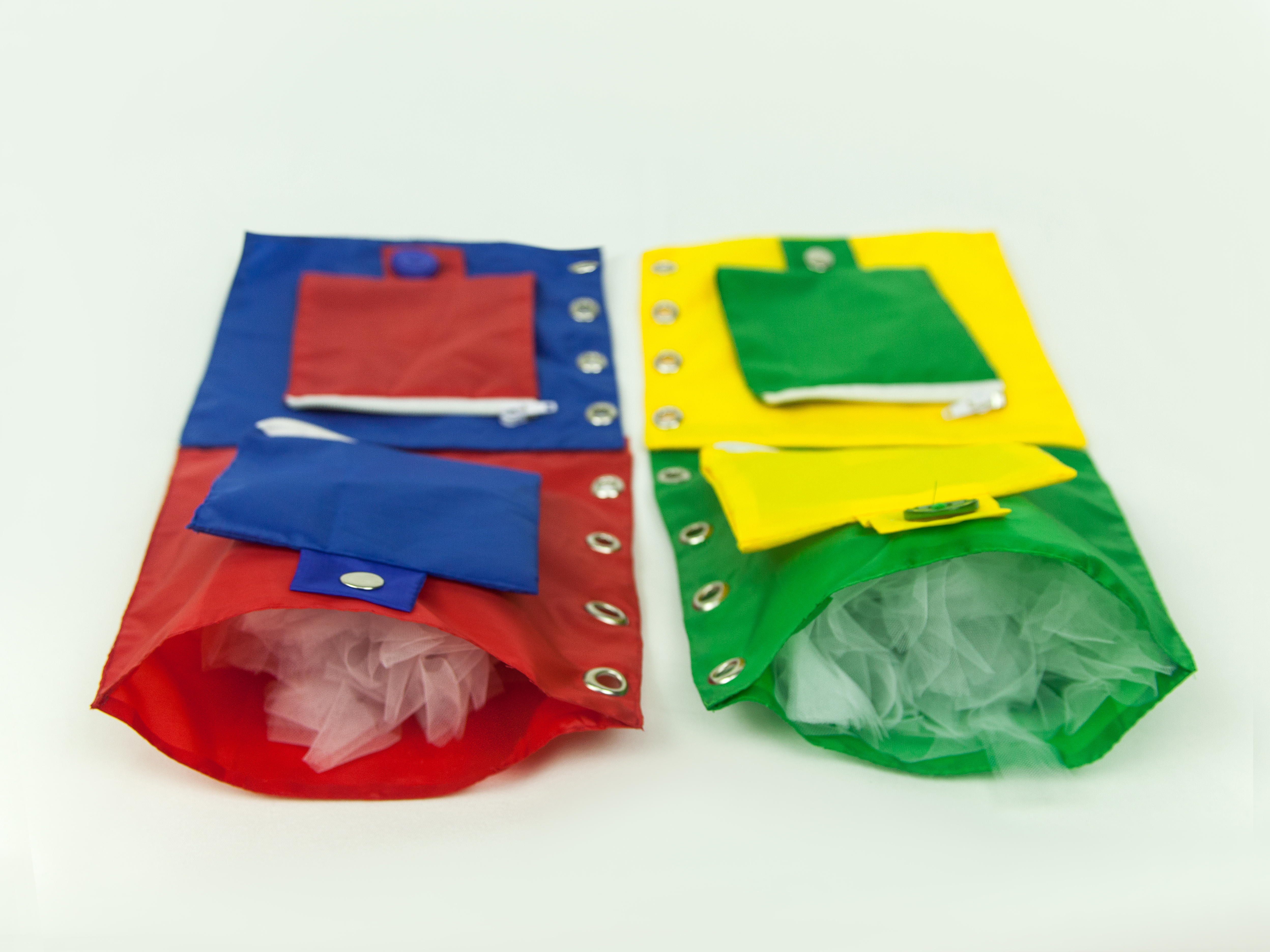 Комплектация: 4 больших кармана (синий, красный, желтый, зеленый) и 4 маленьких (синий, красный, желтый, зеленый). Большие карманы скреплены между собой липучкой (по парам) и лентой (по парам). Маленькие карманы соединяются по парам с помощью молнии, прикрепляются к большим с помощью липучки(все четыре), пуговиц (два), кнопок (две).