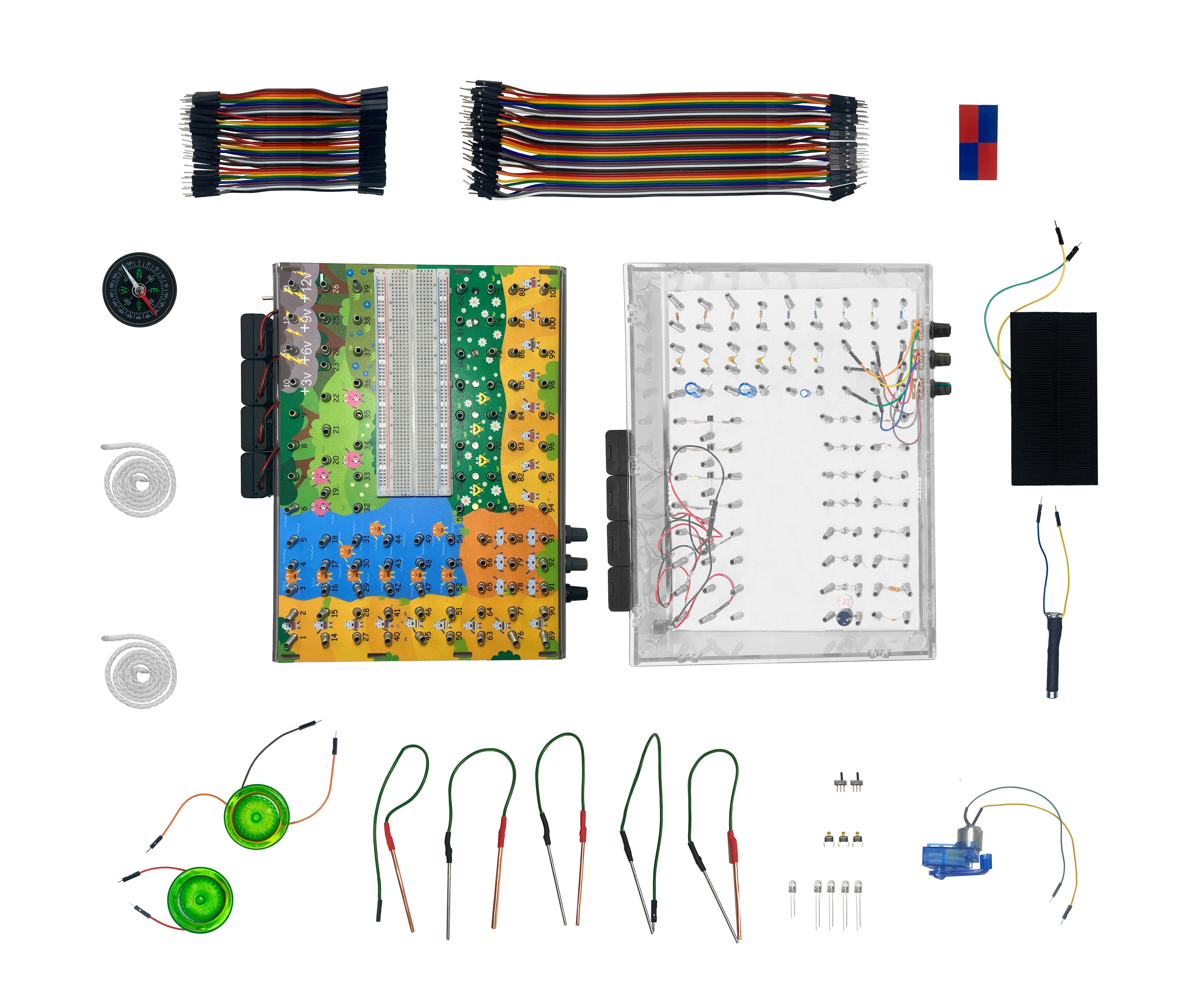 Игровой комплекс включает монтажный столик, предназначенный для упрощения сборки электронных схем. Он создает возможность собирать и тестировать их без пайки соединений. Для сборки схем необходимо просто отогнуть пружинку и вставить клемму провода, соединяя контакты. Такой способ соединения проводов абсолютно безопасен для ребенка, прост и понятен. Вся электронная база основных компонентов (резистор, конденсатор, транзистор, сопротивление и др.), используемая на монтажном столике, представлена в виде веселых человечков – помощников основного персонажа Ёжика Терри.