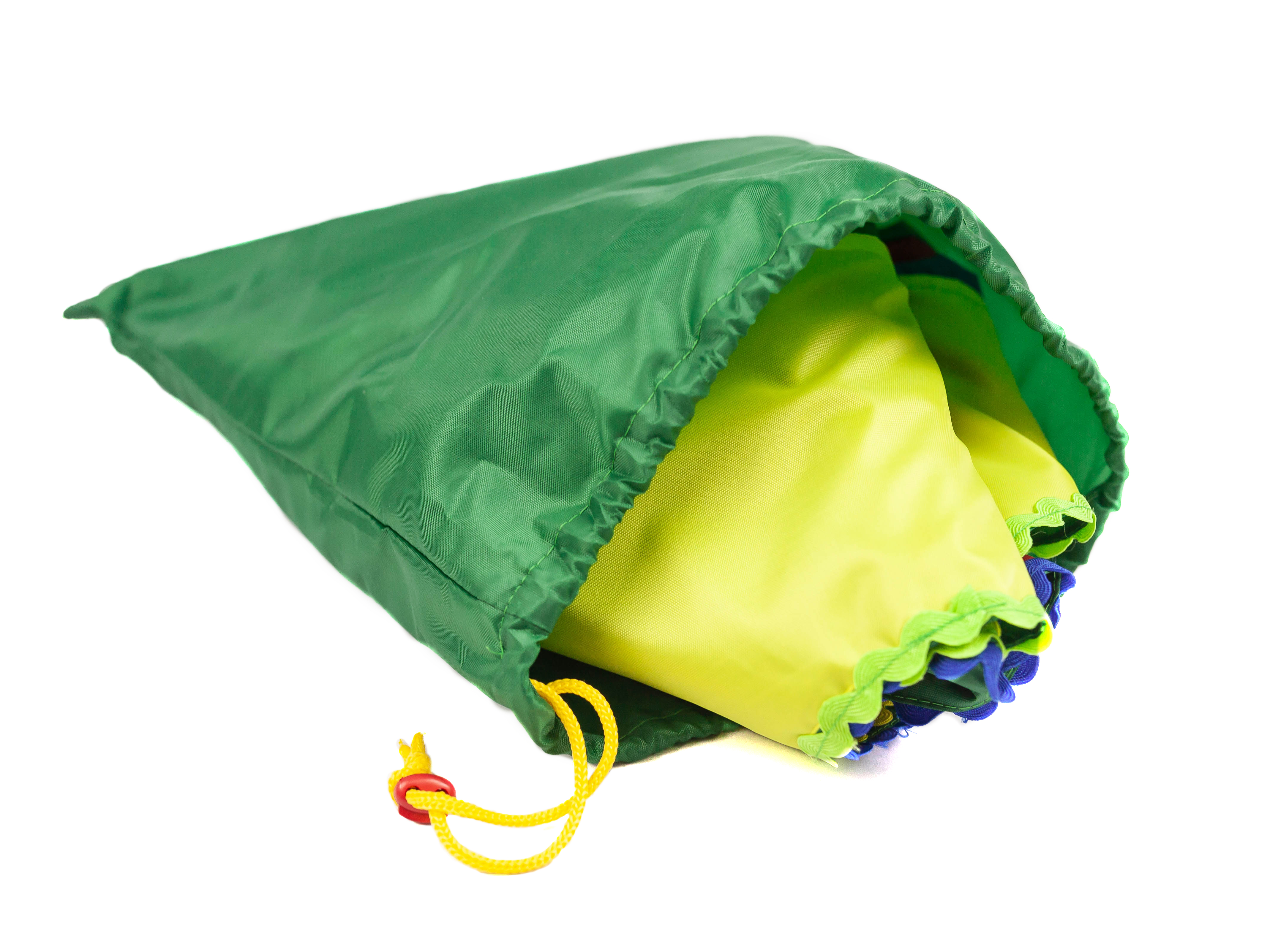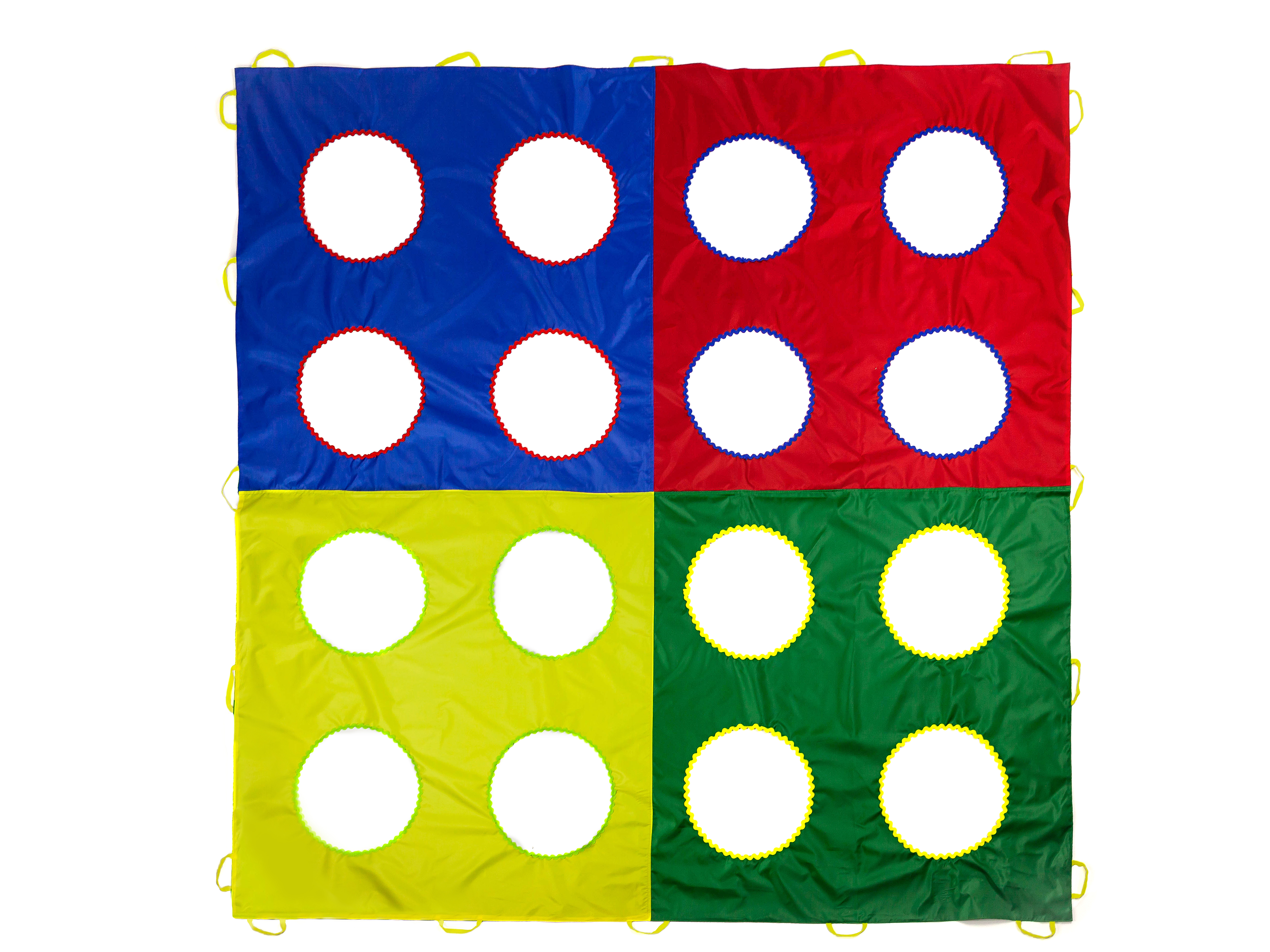 Комплектация: игровой коврик, разделенный на 4 сегмента по цветам с одной стороны (синий, красный, желтый, зеленый), одноцветный с другой стороны  круглыми дырками диаметром 28 см (всего 16 штук) по 4 отверстия в каждом сегменте, обработаны тесьмой зиг-заг,  с ручками ко периметру (20 штук), люверсами   (всего 8 штук), чехол для хранения.
