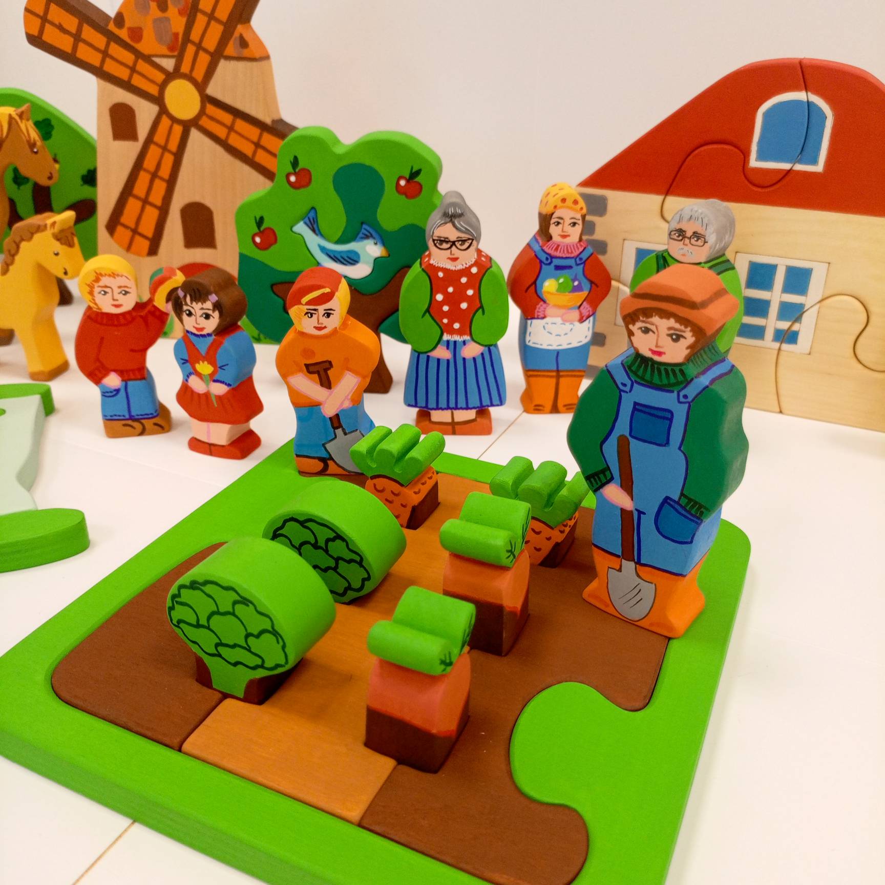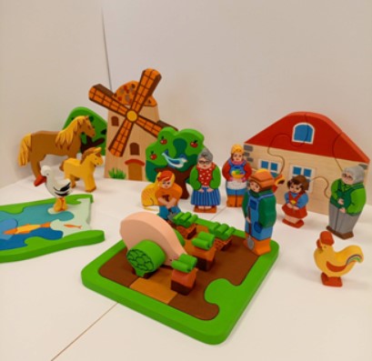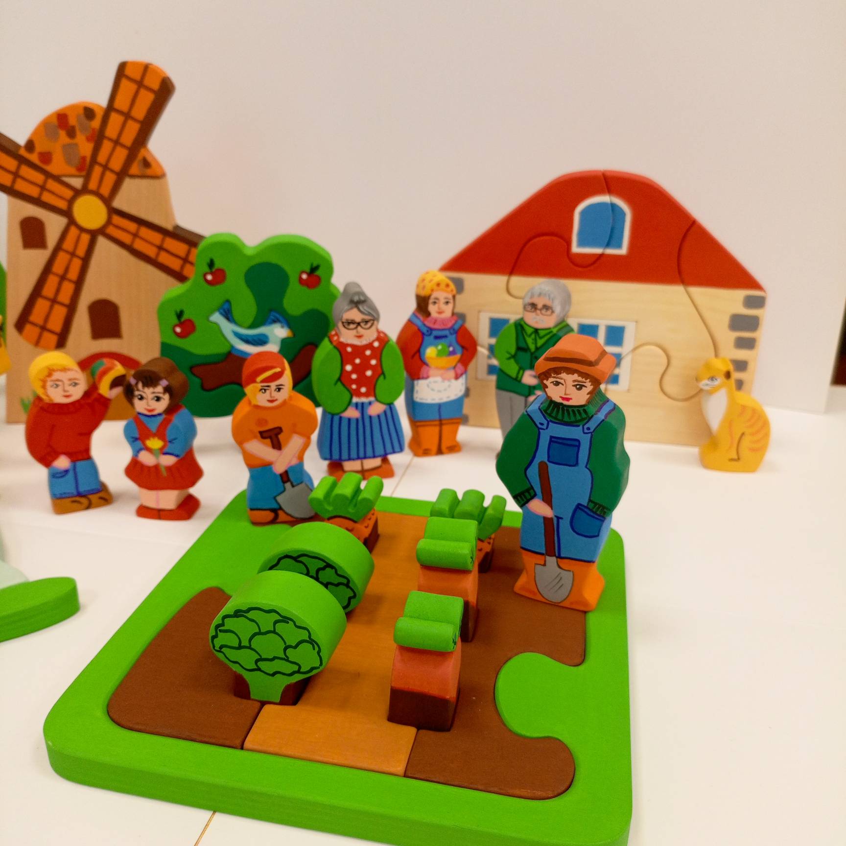 Не менее 45 фигурок и элементов из дерева и древесных материалов. Дом-пазл,  дерево-пазл, река-пазл (внутри водной поверхности можно выделить отдельно рыбу),цапля, камыши, жители деревни:(семья- Мама с вазой, папа с лопатой, девочка с цветком в руках, мальчик с мячиком, мальчик с лопатой, бабушка, дедушка). Грядка(огород)  в виде пазла в рамке, набор овощей-вкладышей: свекла красная, морковка, капуста кочанная, домашние животные: лошадь с жеребенком, барашек, овечка, ягненок, кошка, собака, домашняя птица , элементы забора, мельница, лодка, рыбак , рыба. Яблоня с птичкой, дубок с желудями (деревья разбираются, крону можно убрать и использовать стволы как декорации к зимнему сюжету)