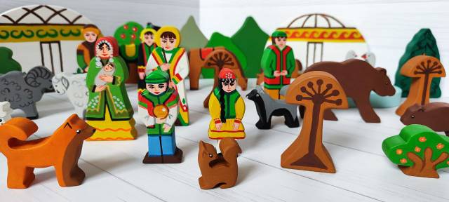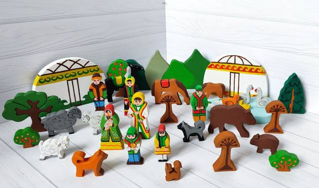 Не менее 35 деревянных фигурок. Юрты,  кони, овцы, утки, собаки, фигурки детей, женщины, мужчины в костюмах с башкирским национальным орнаментом, пруд, улей, водоем, горы, кустики, деревья, цветок курая.