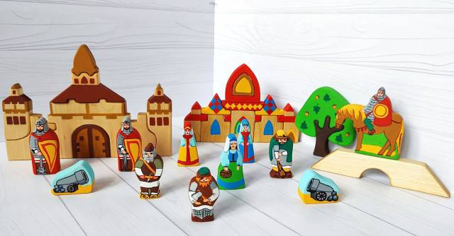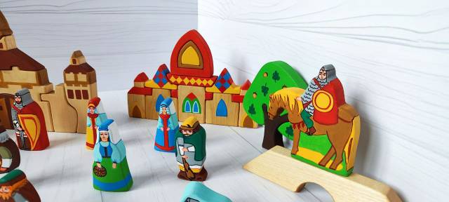 Не менее 35 фигурок и элементов из дерева. Крепость-пазл, терем-пазл, деревья, мост, конь богатырский, богатыри, разбойники, пушки, жительницы крепости.