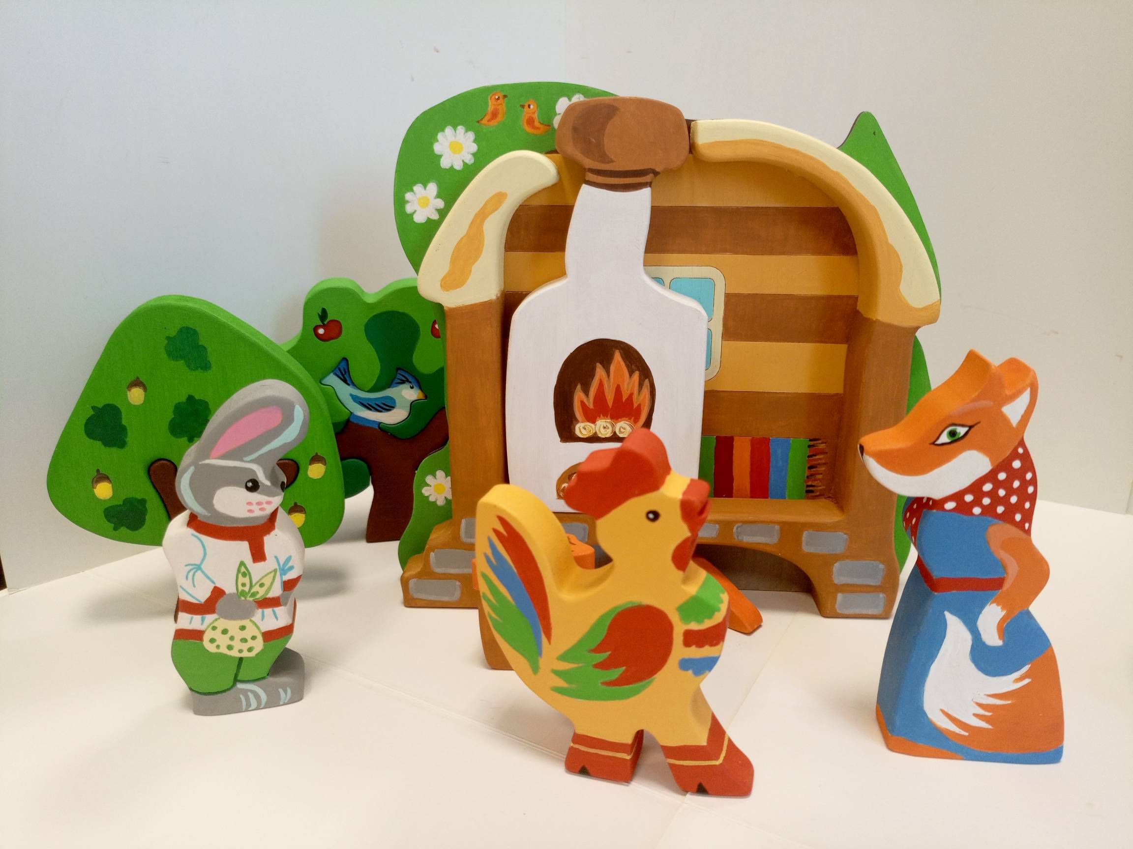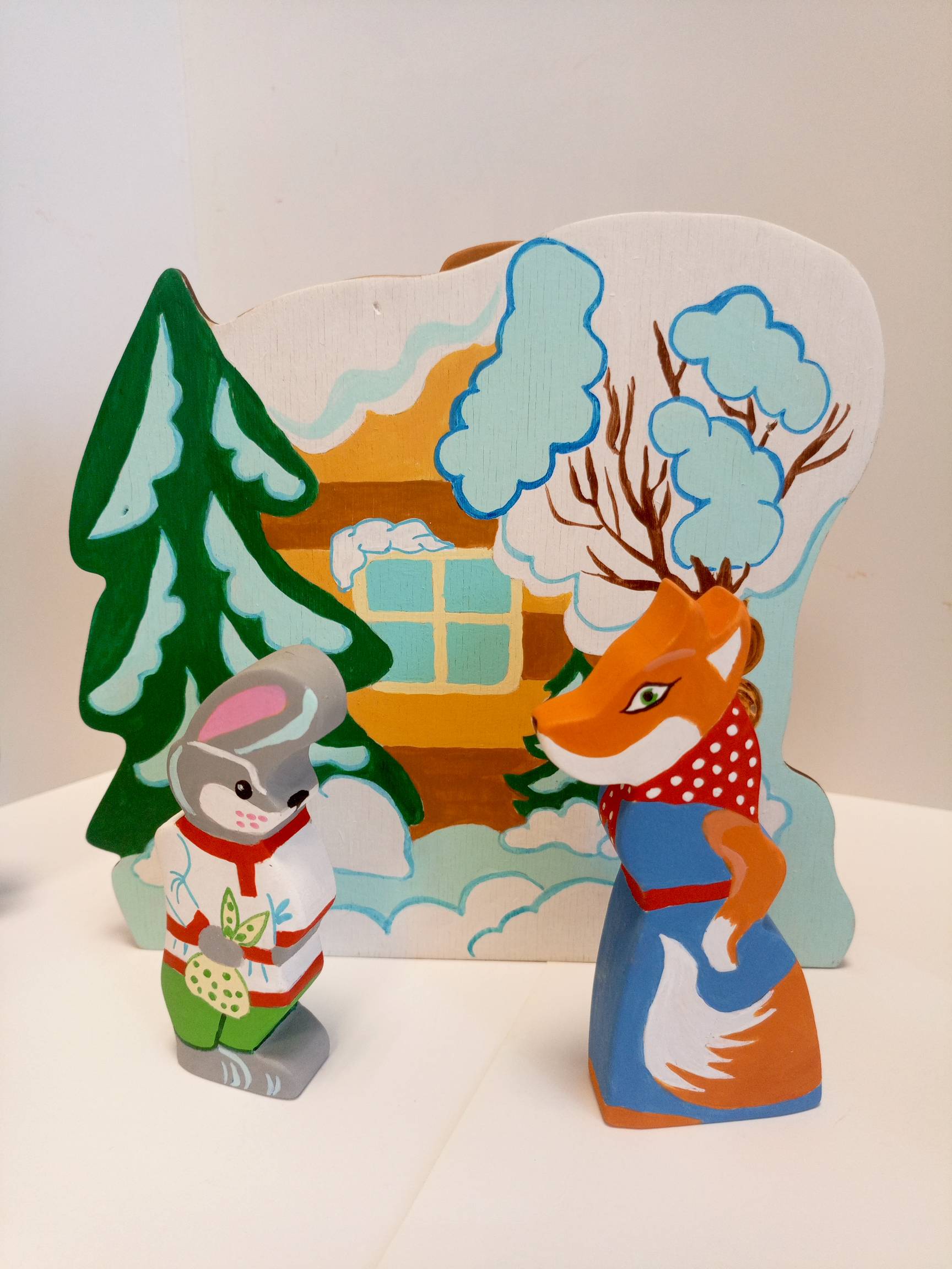 Избушка лубяная с декорацией Зимний лес, избушка ледяная с декорацией Весенний лес, проталины, печка, стол, крынка, скамейка, морковка-3 шт.,  фигурки персонажей сказки-лиса в сарафане, заяц в рубахе, собака и щенок, петух в сапогах, медведь, волк.
