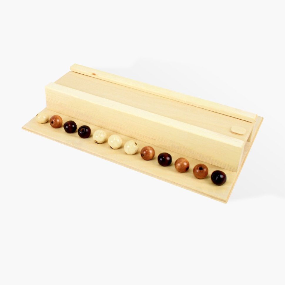 Многие смотрели шоу "Форт Боярд", где есть этап испытаний "Игры мастеров". Все задания в этом этапе на внимательность, ловкость, смекалку. Игра "Цветные шарики" проверяет зрительную память игроков и помогает ее развивать. Количество игроков - 2, ограничений по возрасту нет. Цель игры: Игрокам необходимо запомнить и повторить ряд из шариков разного цвета, который загадал ведущий. Ведущий открывает средний отсек на 30 сек, показывая цепочку цветных шариков для запоминания, и закрывает его снова. Когда игроки выложили свои шарики, ведущий снова открывает средний отсек, но не сразу, а по 1 шарику. Проигрывает тот, кто первым допустил ошибку. В зависимости от ситуации можно самостоятельно придумывать правила игры и экспериментировать! Размер : 29х18х4.5 см Комплектация : игровое поле, комплект шариков Материалы : массив дерева, фанера, покрытие - морилка, акриловый лак