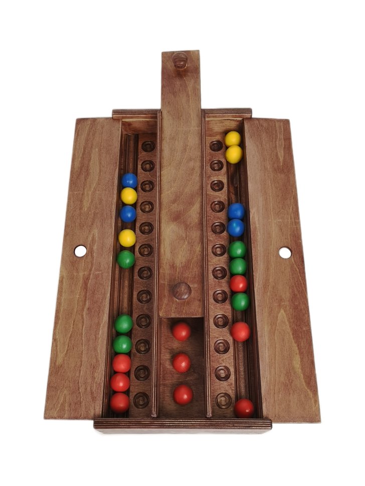 Многие смотрели шоу "Форт Боярд", где есть этап испытаний "Игры мастеров". Все задания в этом этапе на внимательность, ловкость, смекалку. Игра "Цветные шарики" проверяет зрительную память игроков и помогает ее развивать. Количество игроков - 2, ограничений по возрасту нет. Цель игры: Игрокам необходимо запомнить и повторить ряд из шариков разного цвета, который загадал ведущий. Ведущий открывает средний отсек на 30 сек, показывая цепочку цветных шариков для запоминания, и закрывает его снова. Когда игроки выложили свои шарики, ведущий снова открывает средний отсек, но не сразу, а по 1 шарику. Проигрывает тот, кто первым допустил ошибку. В зависимости от ситуации можно самостоятельно придумывать правила игры и экспериментировать! Размер : 50х40х5.5 см Комплектация : игровое поле, комплект шариков Материалы : массив дерева, фанера, покрытие - морилка, акриловые лак и краски